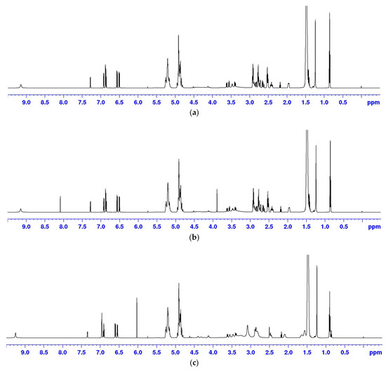 1H NMR spectra of samples. (a) Spectrum of rotigotine microspheres; (b) spectrum of rotigotine microspheres and DMT; (c) spectrum of rotigotine microspheres and MA.