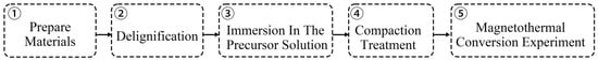 Figure 1 shows the experimental flowchart. Addressing this research gap, this study aims to systematically investigate magnetothermal conversion performance of wood-based magnetic composites, focusing on revealing the structure–property relationship governing their magnetothermal conversion efficiency. To achieve this, we employed a simple in situ synthesis method to generate Fe3O4 nanoparticles within eucalyptus wood samples. The porous structure of the wood template was precisely controlled through a delignification process. We thoroughly investigated the effects of impregnation time in the precursor solution (24, 48, and 72 h) on the loading capacity and distribution morphology of the magnetic phase. Additionally, the role of subsequent densification treatment on the structure and properties of the composite materials was evaluated. The magnetothermal conversion capabilities of all prepared composites were quantitatively assessed using a custom-built alternating magnetic field apparatus.