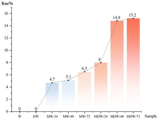 Rm is the loading rate of Fe3O4 nanoparticles on the wood, Wm is the weight of the magnetic wood, and Wn refers to the weight of the wood sample before treatment. Treatment conditions of different samples and Fe3O4 loading rates are shown in Table 1 and Figure 2.