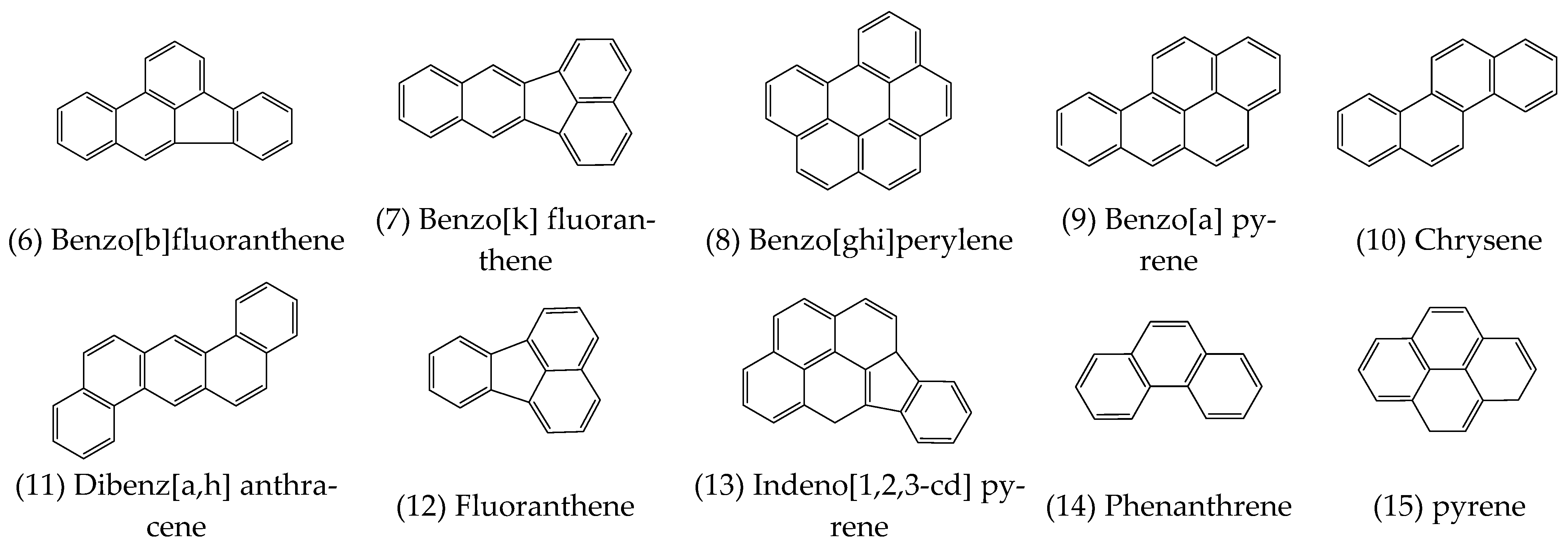- Choi, E.; Lee, J.Y.; Kim, Y.P. Long-term (1993–2018) particulate polycyclic aromatic hydrocarbons (PAHs) concentration trend in the atmosphere of Seoul: Changes in major sources and health effects. Atmos. Environ. 2024, 325, 11. [Google Scholar] [CrossRef]