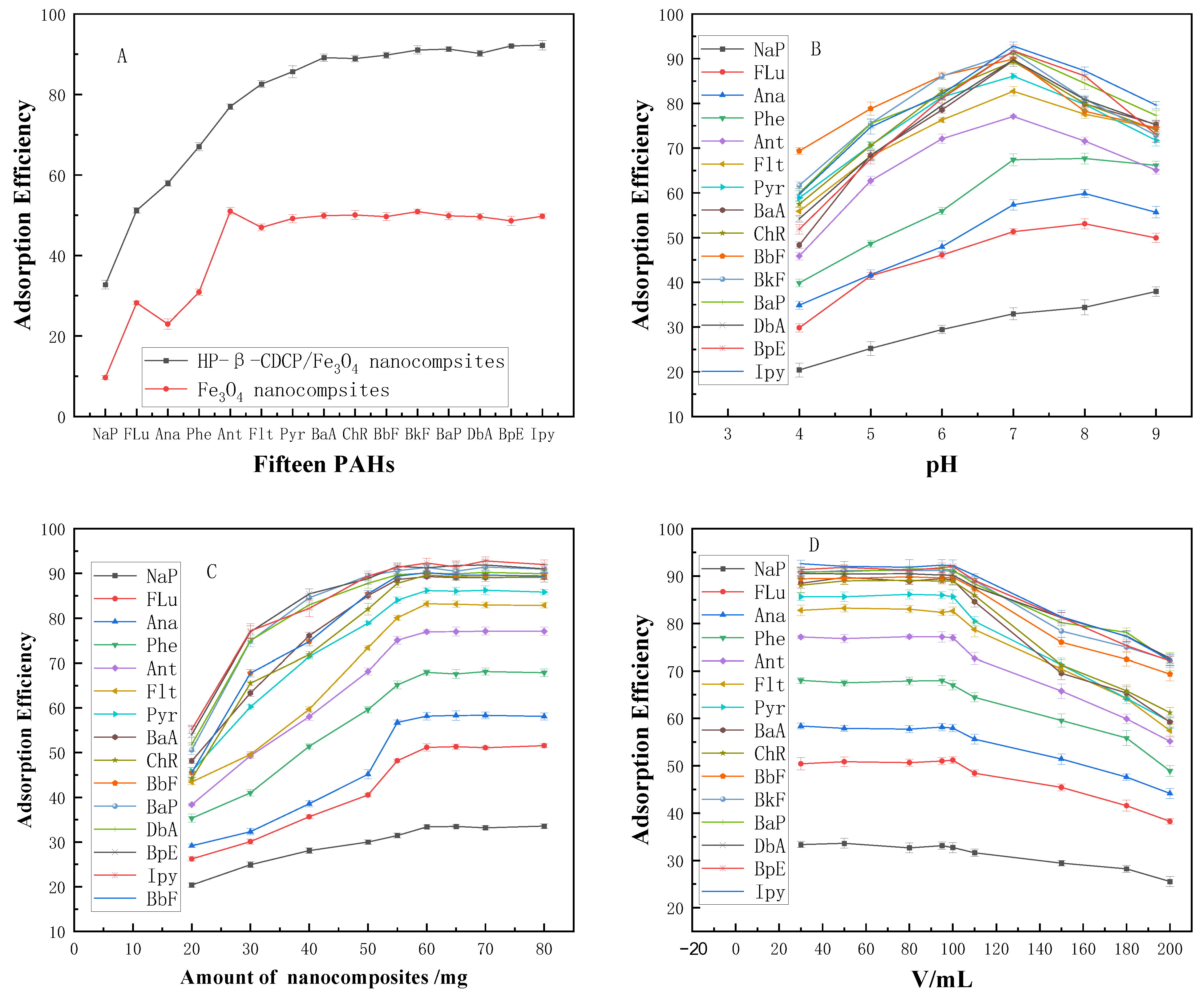 | HP-β-CDCP/Fe3O4 nanocomposites | Fifteen representative PAHs | 6.46–19.0 | 33.9–93.1 | This work |