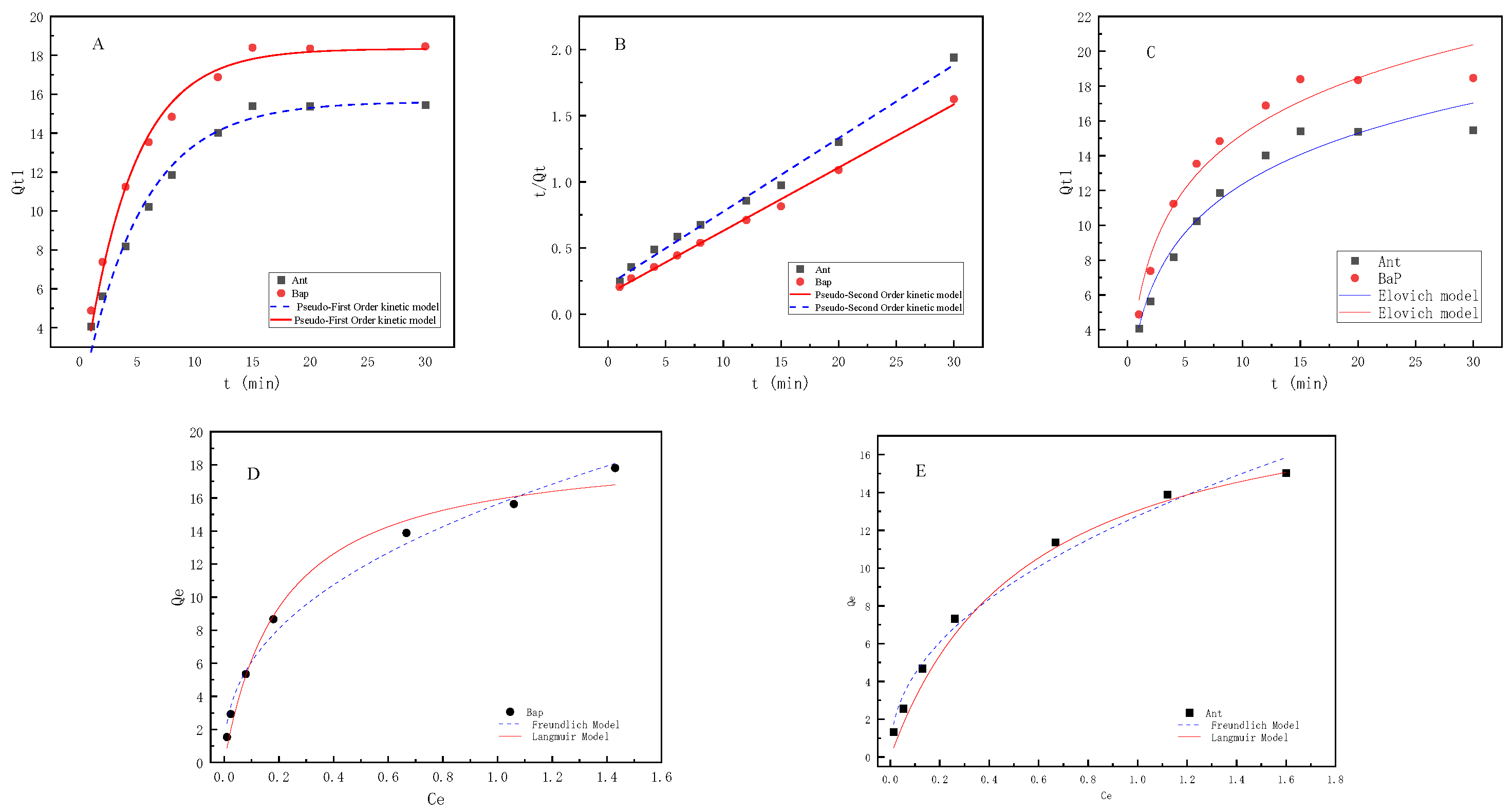 3.3. Adsorption Kinetics of HP-β-CDCP/Fe3O4 Nanocomposites