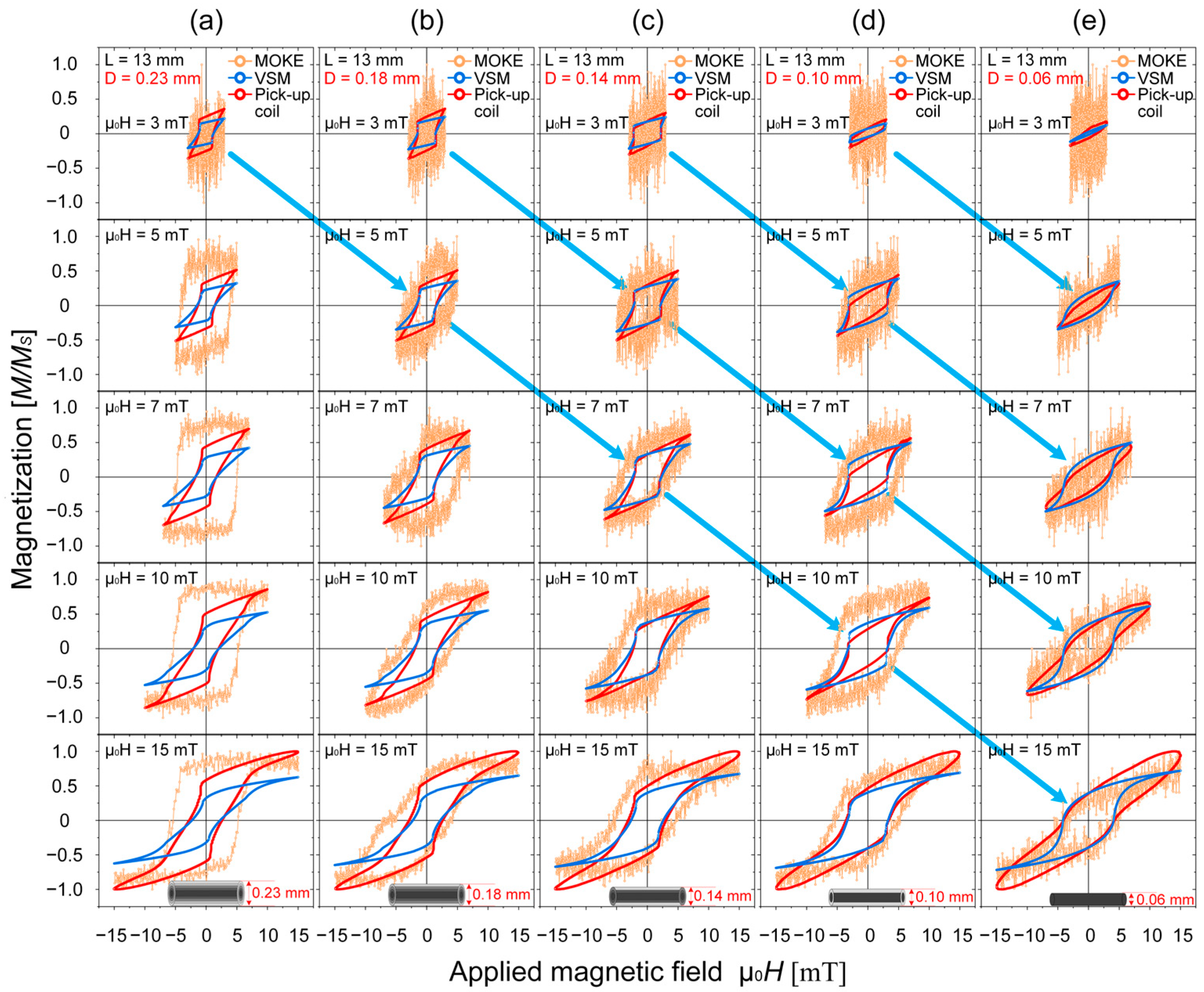 The divergent behavior observed via MOKE is not contradictory but highly instructive, as it underscores the radial inhomogeneity of the magnetic structure in our wires. As established, our Wiegand wires possess a soft magnetic outer layer. MOKE probes only the magnetization dynamics within the optical penetration depth (tens of nanometers) of this surface. For the standard 0.23 mm wire, the intact soft outer layer hosts the large Barkhausen jump, which dominates the MOKE signal and results in a high, sharp switching field. For the etched wires (0.18–0.06 mm), the chemical etching has progressively removed this specific soft outer layer responsible for the surface jump. Consequently, the MOKE signal from the etched surface originates from underlying magnetic layers with different reversal characteristics, leading to smaller, more gradual loops and an apparently lower coercive field.