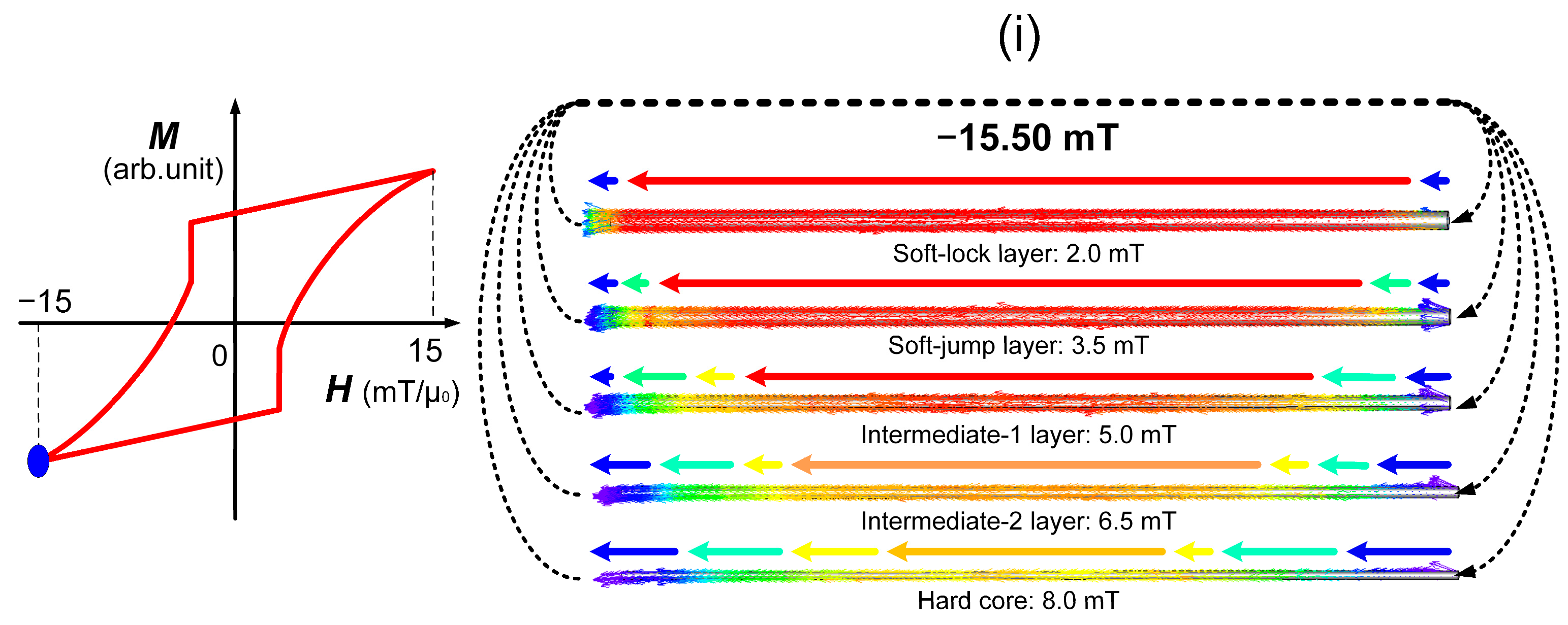 At a field strength of −5.12 mT, the magnetic locking coupling between the soft-jump and intermediate-1 layers collapses, leading to the establishment of a new magnetic locking coupling between the intermediate-1 and intermediate-2 layers, as shown in