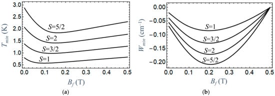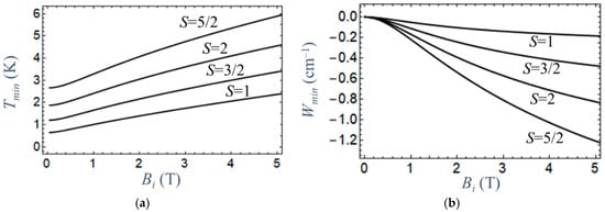 This result can be understood using the guiding rule formulated in Section 2.3. This result can be realized based on the above-stated rule concerning the signs of the partial contributions to W. Indeed, as one can see from Figure A1 (Appendix A), the energy gaps between the ground and all the excited states are decreased upon switching off the magnetic field (all Ek(Bf = 0) < Ek(Bi) and hence for all excited states. As a result, the overall heat release value is negative, which means the heat absorption (cooling) occurs for all complexes with D < 0. Each W(T) curve in Figure 1 passes through the minimum corresponding to the most efficient heat absorption. It follows from the comparison of the temperature dependencies calculated for different complexes that the efficiency of heat absorption increases with the increase in spin S, and its maximum (minimum of W) is shifted towards higher temperatures. This is evidently due to the fact that the number of excited states, which produce negative contributions to W, is higher for complexes with higher S. This can also be seen from the plots in Figure 2, in which the values Tmin and Wmin = W(Tmin) are shown as functions of the field Bi.