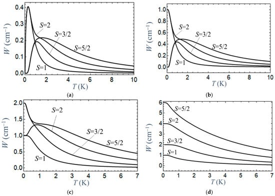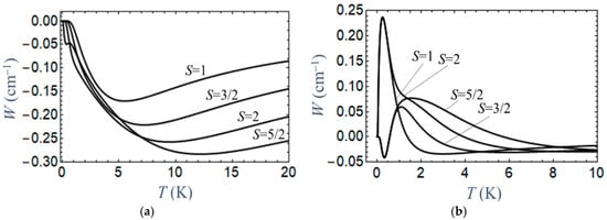 Let us first consider the case of complete and sudden switching off of the magnetic field, corresponding to a change from an initial field value Bi > 0 to a final field Bf = 0. Figure 1 shows the temperature dependence of the heat exchange W evaluated for complexes with spins S = 1, 3/2, 2, and 5/2 using Equation (5) and the expressions for the energies of the Zeeman states collected in Appendix A, Table A1 (for all systems it is assumed that D = −1 cm−1 and g|| = 2).