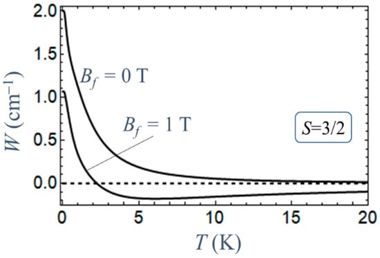 The described high-temperature absorption occurs also when switching the field off changes the ground state. This situation is shown in Figure 7, in which the cases of complete and incomplete field switching off are compared for complex with S = 3/2. It is seen that at Bf ≠ 0, the W(T) curve at low temperatures shows a monotonic decrease like in the case of full field quenching; however, at higher temperatures the W values become negative, and the W(T) curve passes through the minimum and then goes to zero. It is also remarkable that, in case of incomplete field quenching, the low-temperature limit proves to be lower than that which arises when the field is fully switched off. Thus, for a complex with S = 3/2, the energy gap between the ground state |−3/2> and the first excited state |−1/2> is equal to 2|D| − g μB Bf in the case shown in Figure 7. As a result, WT→0 = 2|D|−g μB Bf proves to be smaller than the low-temperature limit WT→0 = 2|D| occurring at full field quenching.