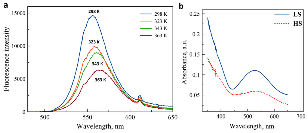 (a) Photoluminescence emission spectra of CdTe nanocrystals at a few selected temperatures (excitation at 450 nm). (b) Absorption spectra of the SCO complex in the HS and LS states (reproduced by permission of The Royal Society of Chemistry).