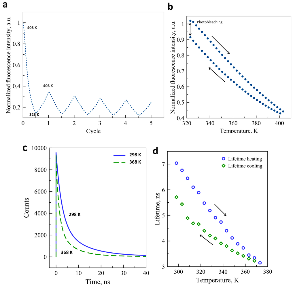 (a) Fluorescence intensity variation of CdTe quantum dots for 5 consecutive temperature cycles (λex = 450 nm, λem = 550 nm);(b) Temperature dependence of the luminescence intensity of CdTe through a complete heating-cooling cycle; (c) Luminescence decay curves of CdTe nanocrystals at 298 K and 368 K (λex = 449 nm, λem = 540 nm); (d) Lifetime of CdTe luminescence as a function of temperature on heating and cooling.
