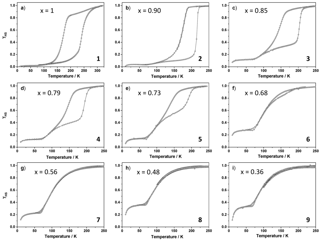 - Baldé, C.; Desplanches, C.; Gütlich, P.; Freysz, E.; Létard, J.-F. Effect of the metal dilution on the thermal and light-induced spin transition in [FexMn1−x(bpp)2](NCSe)2: When T(LIESST) reaches T1/2. Inorg. Chim. Acta 2008, 361, 3529–3533. [Google Scholar] [CrossRef]