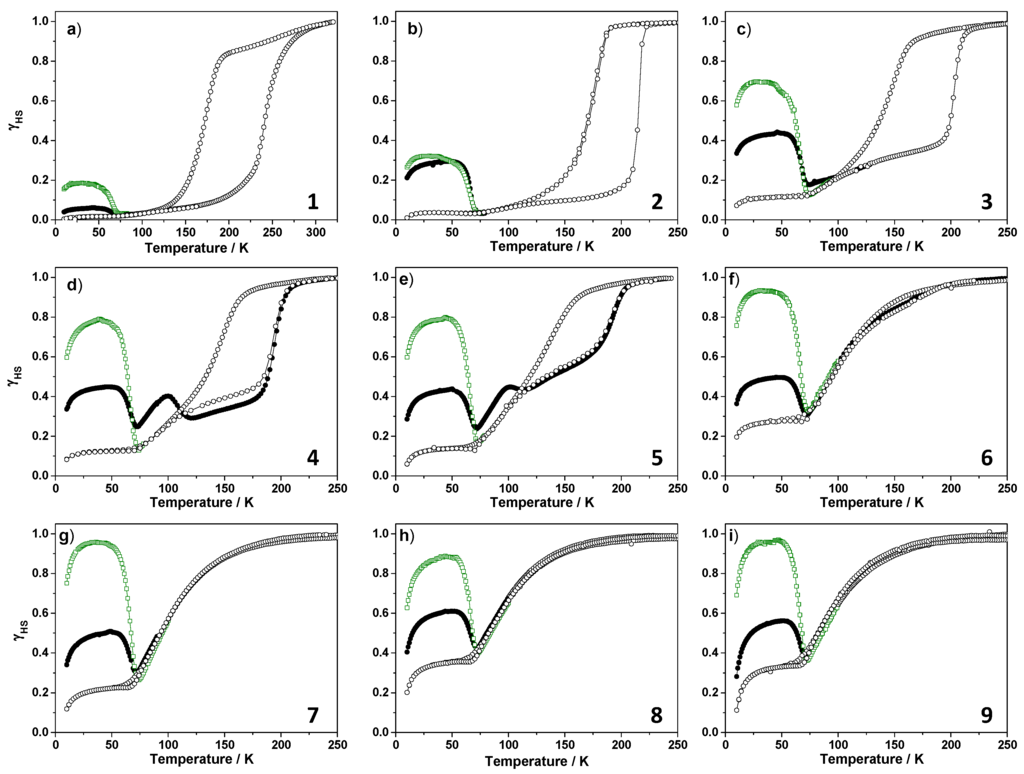 | Compound | x | T1/2↑ (K) | T1/2↓ (K) | ∆T (K) | T(LIESST) (K) | T(TIESST) (K) |