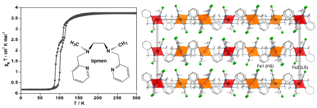 [Fe(4,4′-bipy)2(NCS)2]·4CHCl3: Spin crossover behavior (left); and perspective view of a layer displaying the checkerboard 1HS-1LS order in the IP at 120 K (right). Red and orange octahedrons correspond to LS and HS sites, respectively.