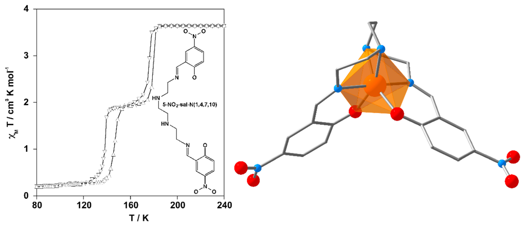 Spin crossover behavior of [FeII{5-NO2-sal-N(1,4,7,10)}] (left) and molecular structure (right).