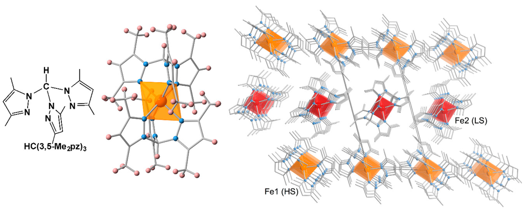 Molecular structure of the ligand [HC(3,5-Me2pz)3] (left) and {Fe[HC(3,5-Me2pz)3]2}2+ cation (middle). Projection of the crystal packing on the ac plane showing the ordering of the LS and HS layers (BF4− anions have been removed) (right).