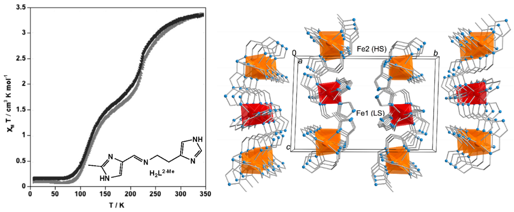 Within the family of imidazole-based FeII SCO complexes, Bréfuel and Matsumoto et al. have found that the perchlorate salt of the aforementioned complex [FeII(H2L*2−Me)2]2+ displays a strong cooperative spin transition centered at Tc = 171.5 K featuring a hysteresis loop ca. 5 K wide and simultaneous crystallographic phase transition between the space groups P21/n (HS) and P21 (LS) [].