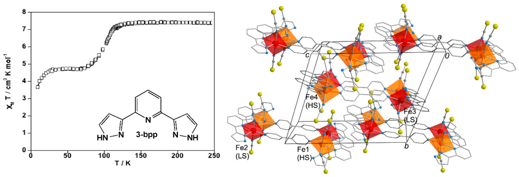 The complex {[Fe(3-bpp)(NCS)2]2(4,4′-bipyridine)}·2CH3OH (3-bpp = 2,6-bis(pyrazol-3-yl)pyridine) reported by Létard, Rosa and Guionneau et al. affords another example of half SCO behavior and CSB in a dinuclear unit. In the temperature interval 250–120 K, χMT is equal to 7.2 cm3·K·mol−1 and consistent with two FeII centers in the HS state. Below 120 K, χMT gradually drops to 4.7 cm3·K·mol−1, a value ca. 15% higher than expected for a half SCO (Figure 11). Below 70 K, no further spin conversion occurs, most probably due to kinetic effects. The unit cell is monoclinic, its space group being P21/n, with an inversion center located on the 4,4′-bipy bridge (phase I). This structure, characterized by one independent HS FeII site, is stable in the temperature interval 298–120 K. At ca. 115 K, a crystallographic phase transition coincides with the onset of the SCO. Consequently, in the new Cc space group the unit cell volume quadruples, and contains four crystallographically independent HS FeII centers segregated in two distinct dinuclear units (phase II). At 30 K, where χMT is consistent with a 1:1 mixture of HS and LS states, the crystal is triclinic, , and the unit cell volume halves. Despite this, the unit cell contains two distinct asymmetric dinuclear units displaying a LS-HS state (phase III) [,].