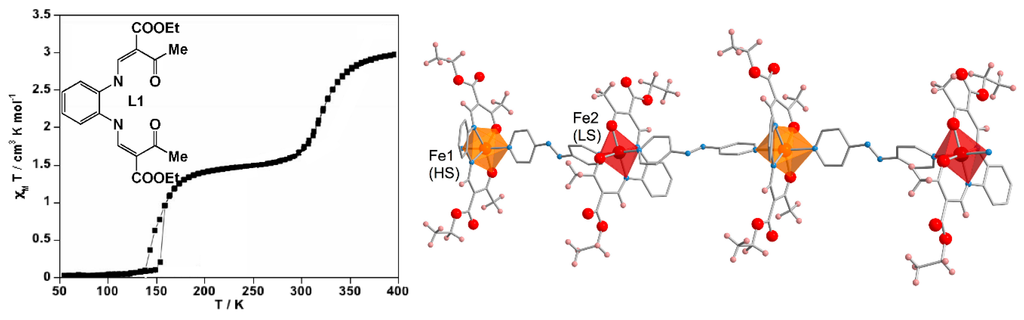 As far as we know the complex [FeL1(azpy)] reported by Weber et al., represents the only example of one-dimensional polymeric SCO displaying an ordered IP state and CSB (L1 is the tetradentate Schiff-like base {diethyl(E,E)-2,2′-[1,2-phenyl-bis(iminomethylidyne)]-bis[3-oxobutanoate]-(2-)-N,N′,O3,O3′} and azpy is the bismonodentate bridging ligand 4,4′-azopyridine). The magnetic behavior of this complex shows a complete two-step transition with steps, centered at Tc2 = 326 K and Tc1 = 152 K, separated by a large plateau (IP). The crystal structure was solved in the IP, at 200 K, where the crystal is orthorhombic, space group P212121, and displays a perfect ordering HS-LS along the chains (Figure 12). In the LS state, the crystal changes to monoclinic P21 (130 K) but, unfortunately, complete analysis of the structure could not be performed due to twinning during the phase transition [].