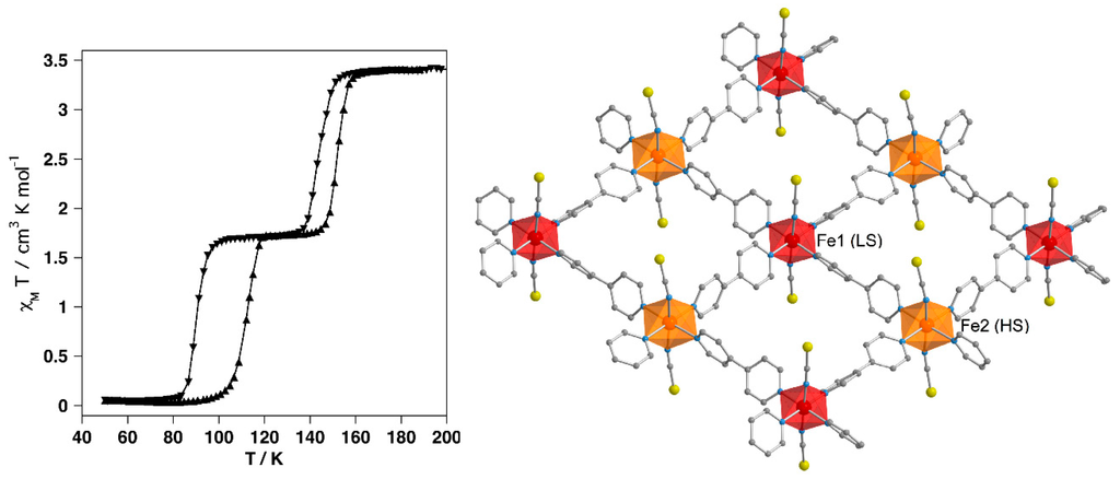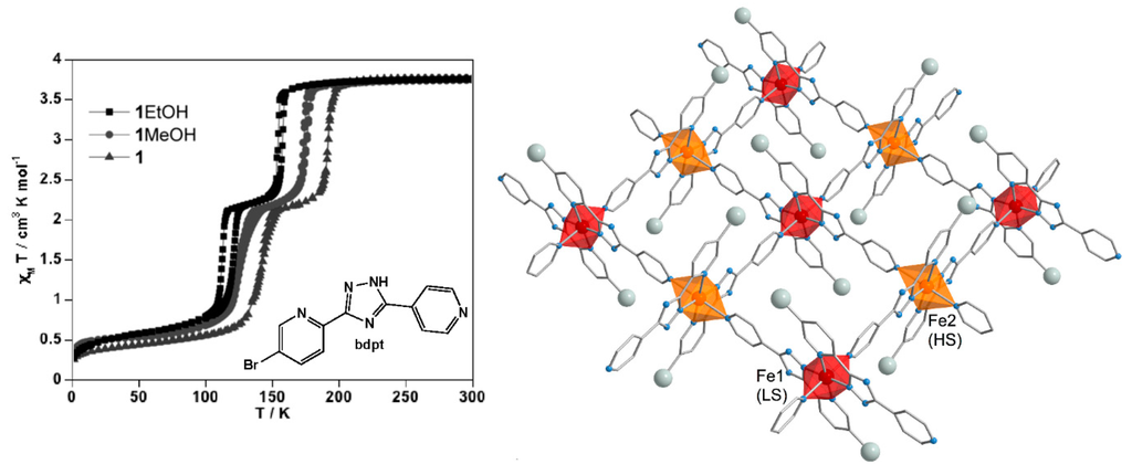 Chen and Zhang et al. have reported the homoleptic two-dimensional coordination polymer [Fe(bdpt)2]·nSolvent where nSolvent = unsolvate, 1EtOH and 1MeOH, and bdpt is the conjugate base of the ionogenic bridging ligand 3-(5-Bromo-2-pyridyl)-5-(4-pyridyl)-1,2,4-triazol. The three derivatives undergo a cooperative two-step SCO involving a 50% mixture of HS and LS centers in the plateau. For the unsolvated compound, the two transitions take place without hysteresis at Tc2 = 192 K and Tc1 = 143.5 K. The inclusion of MeOH (EtOH) induces an average downshift of Tc2 and Tc1 of 18 K and 10.5 K (36 K and 26.5 K), respectively, (Figure 14). This decrease of Tc is accompanied by a slight increase of cooperativity, which is specially pronounced for the EtOH derivative. In the HS state, the unit cell is monoclinic, space group P21/n, and contains one independent FeII site, while in the plateau the unit cell is triclinic, space group , and contains two independent FeII sites with HS and LS spin states, respectively. This IP = 1HS-1LS defines the same checkerboard-like arrangement described for [Fe(bpe)2(NCS)2]·3(acetone) and [Fe(4,4′-bipy)2(NCX)2]·4CHCl3. A re-entrant transition to the monoclinic P21/n space group is observed when the crystal goes to the LS state [].