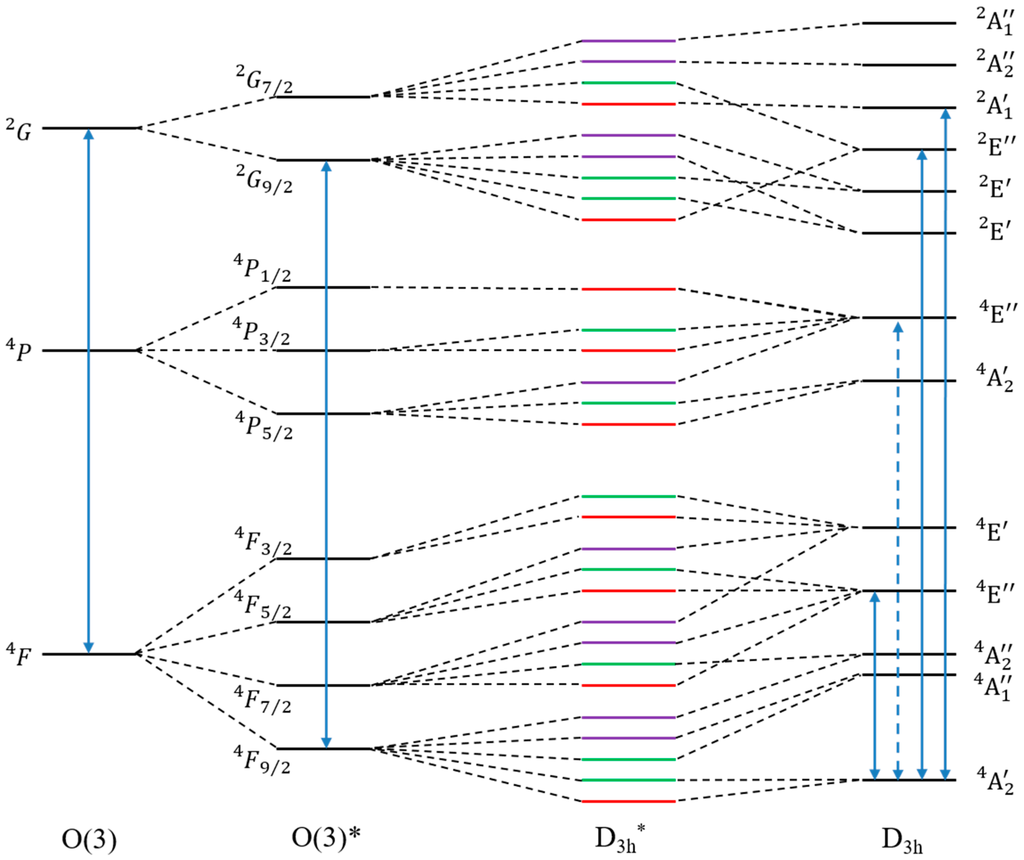 Schematic (not scaled) energy spectrum. As mixing of states with same symmetry in the D3h* are possible only a few dashed lines are indicated to guide the eyes. Blue plain line arrows indicate allowed couplings between states, the dotted arrow indicates a coupling allowed at the molecular level but forbidden in the atom. Red, green and purple lines respectively indicate E1/2, E3/2 and E5/2.