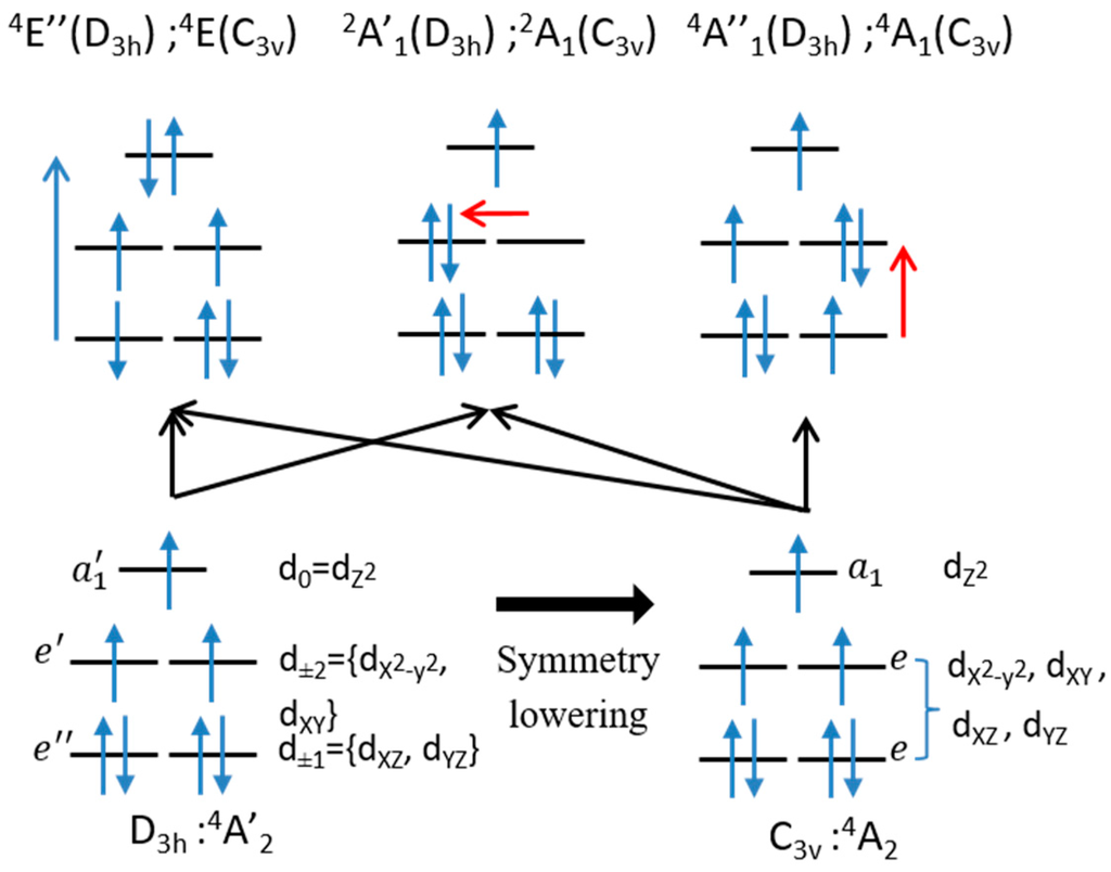 - If an easy axis of magnetization is needed (negative D value), the symmetry lowering from D3h to C3v is beneficial because it allows a coupling with the first excited state that brings a negative contribution to D.