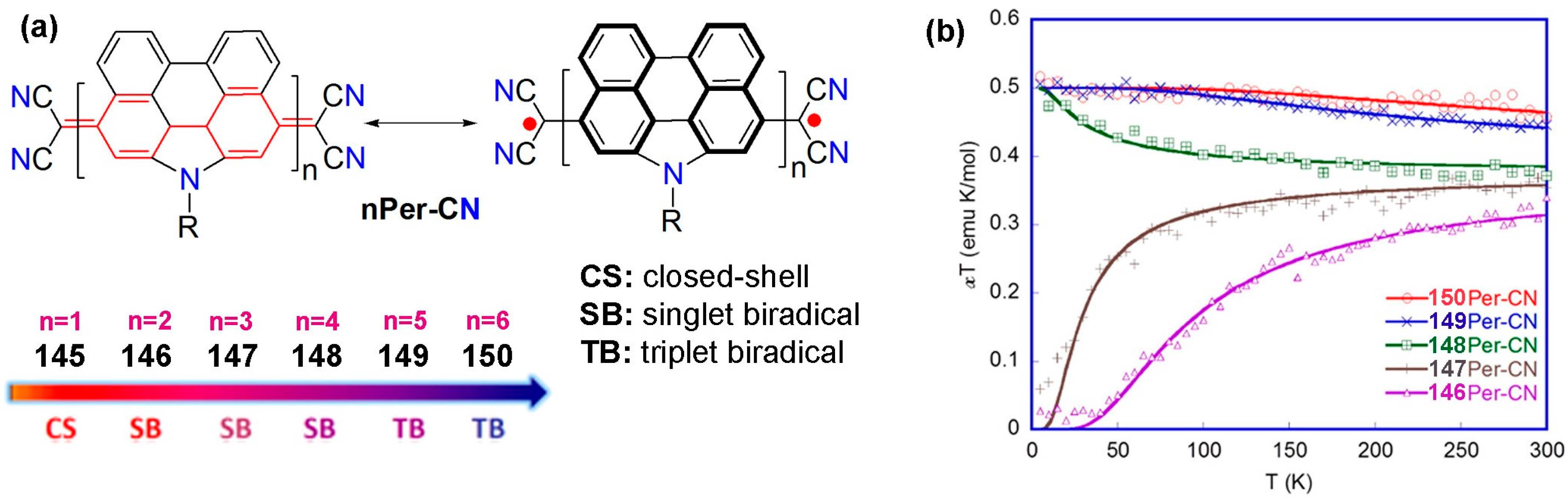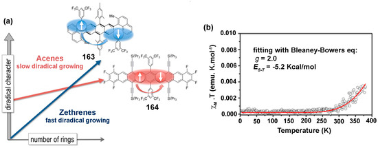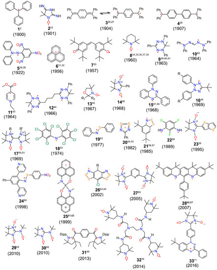 Organic molecules we frequently come across in our daily lives are comprised of closed-shell electronic structures with equal numbers of electrons with up- and down-spins. Therefore, most organic compounds are diamagnetic [1]. The paradigm-shifting discovery of the triphenylmethyl radical [2] by Mosses Gomberg in 1900 was a major landmark in the 20th century, which set the stage for studies of molecules with unpaired electrons, i.e., systems with open-shell electronic structures. After this discovery, several classes of organic radical systems having one or more unpaired electrons have been synthesized [3]. These radical systems can be polyradicals, biradicals and diradicals. In the biradicals, the distance between the two unpaired electrons in the molecule is too large and the electron exchange interaction (J) between them is negligible or nearly negligible [4,5]. On the other hand, when, in a molecule comprised of two unpaired electrons, the magnitude of the dipole-dipole interaction is large enough to produce two spin states, i.e., singlet and triplet, it is referred to as a diradical [4,6]. These novel organic radical systems have initiated a wide range of highly interesting applications in redox-catalysis [7,8], living radical polymerization [9,10,11] and particularly magnetochemistry [12,13], the topic which pertains to this review. In addition, radicals find new-age applications as components in batteries [14,15], molecular spintronics [16], and the kondo effect [17], as well as in chemical biology and medicine as spin-labeling agents, in electron paramagnetic resonance (EPR) imaging and also in the diverse areas of biochemistry [18,19].