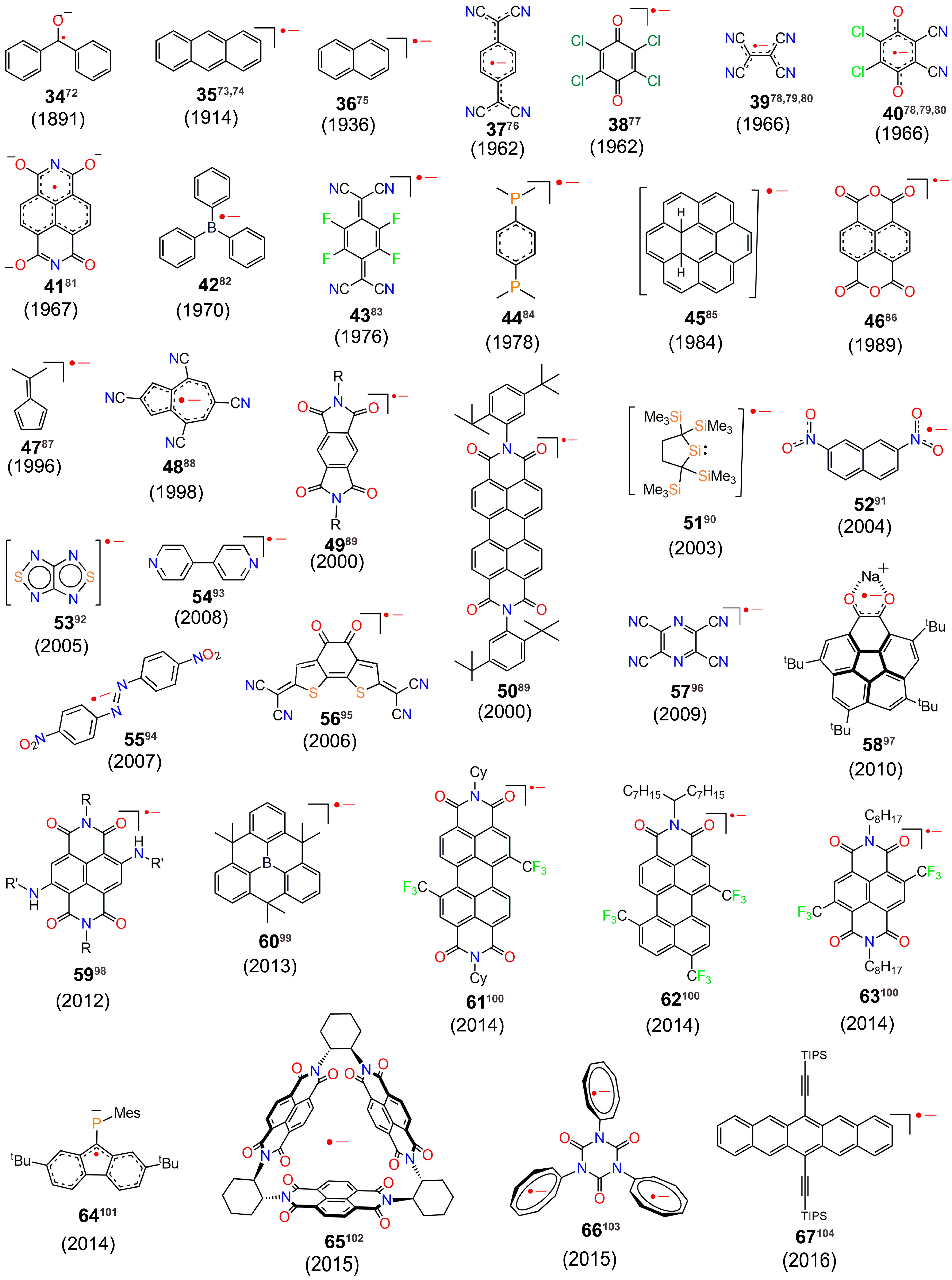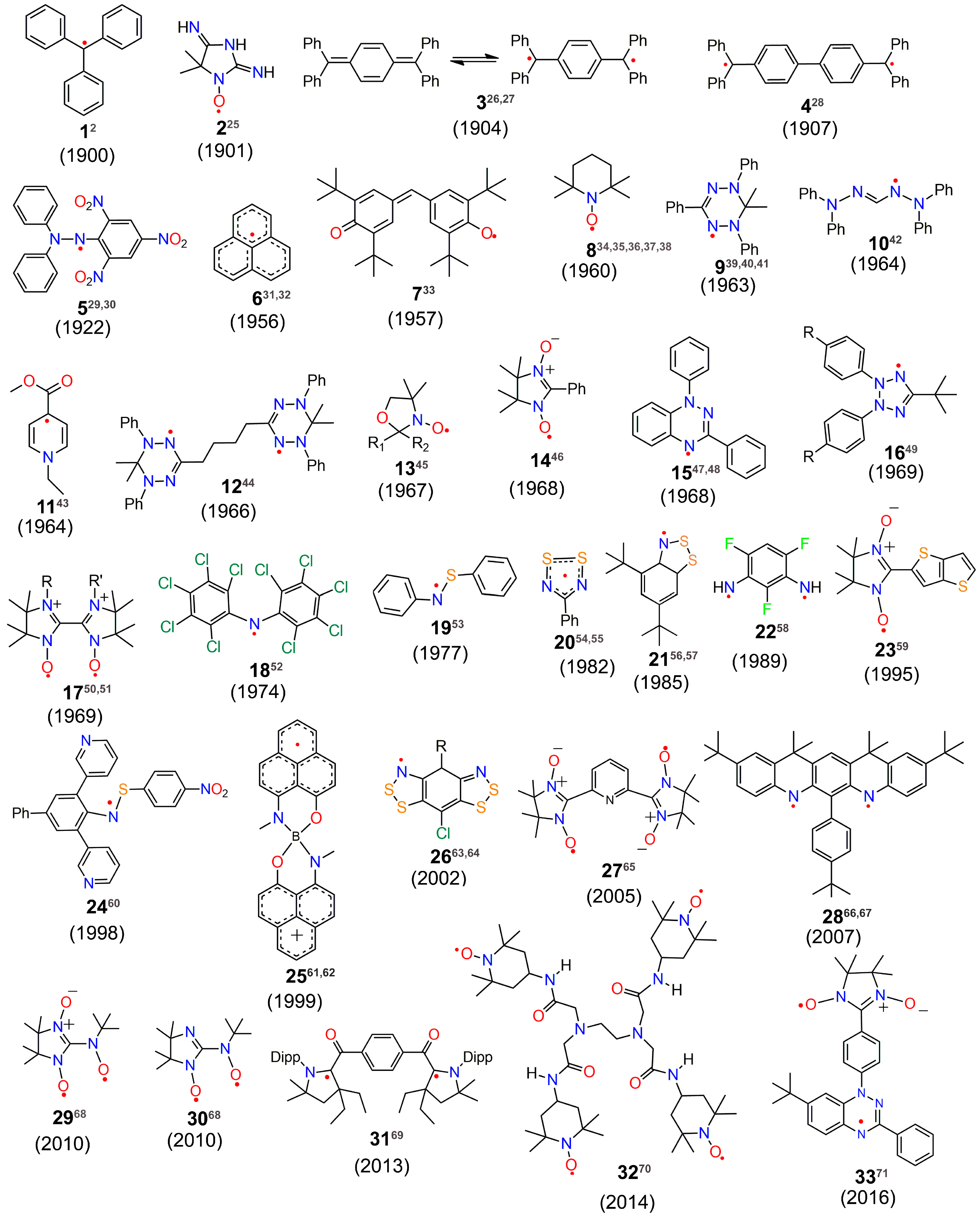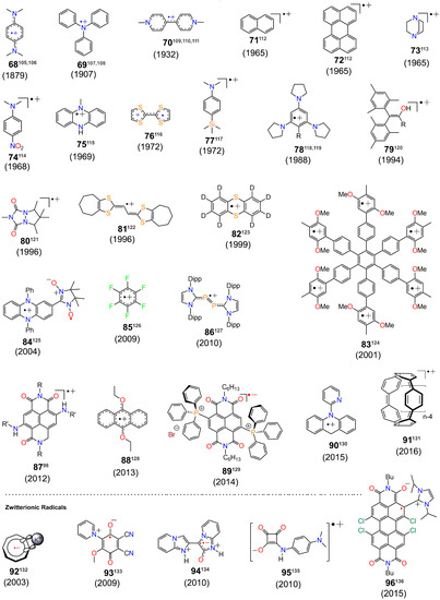 We have collated a list of diverse organic neutral radicals [25,26,27,28,29,30,31,32,33,34,35,36,37,38,39,40,41,42,43,44,45,46,47,48,49,50,51,52,53,54,55,56,57,58,59,60,61,62,63,64,65,66,67,68,69,70,71], radical anions [72,73,74,75,76,77,78,79,80,81,82,83,84,85,86,87,88,89,90,91,92,93,94,95,96,97,98,99,100,101,102,103,104], radical cations [105,106,107,108,109,110,111,112,113,114,115,116,117,118,119,120,121,122,123,124,125,126,127,128,129,130,131] and zwitterionic radicals [132,133,134,135,136] in Chart 1, Chart 2 and Chart 3 according to the year of their report. It is to be noted that the list is not exhaustive. The goal has been to acquaint the reader with different classes of radicals that have emerged over time and to illustrate the growing interest towards creation of new organic radicals. Several of these radicals have been isolated and structural characterization has been carried out. Innovative design principles have led to radicals with unprecedented ambient stabilization and also a handful of radicals that can withstand even the acidic chromatography matrix during their purification. Also of tremendous interest to the synthetic radical chemistry community is to improve their opto-electronic properties, having the potential to exhibit multistability. Several of the radicals and radical ions outlined in Chart 1, Chart 2 and Chart 3 have found tremendous applications as organic magnetic molecular materials. After presenting the collection of organic radicals, we have considered the recent (2011 until now) advances made in the design and magnetic studies of π-conjugated organic radicals such as phenalenyl systems, nitronylnitroxides, benzotriazinyl, bisthiazolyl, aminyl-based radicals and polyradicals, and H-bonded Tetrathiafulvalene (TTF)-based radicals (Section 2, Section 3, Section 4, Section 5, Section 6 and Section 7). The examples clearly show that weak noncovalent interactions play a major role in modulating ferromagnetic and antiferromagnetic properties. We have also deliberated on the emerging direction of organic radicals based on polycyclic aromatic hydrocarbons, i.e., zethrenes, organic polyradicals and macrocyclic polyradicals (Section 8).