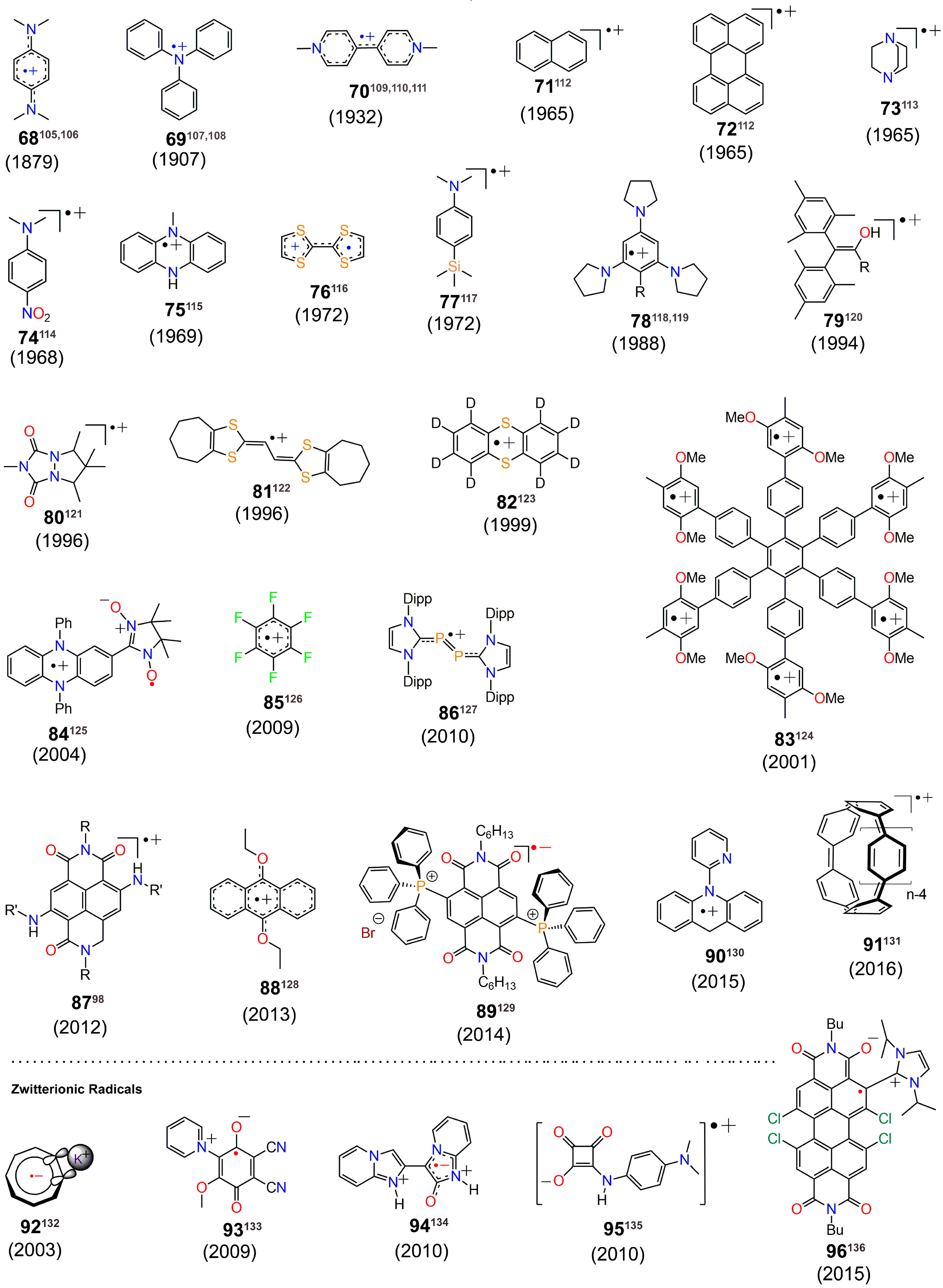 Molecular structures of organic radical cations and zwitterionic radicals.