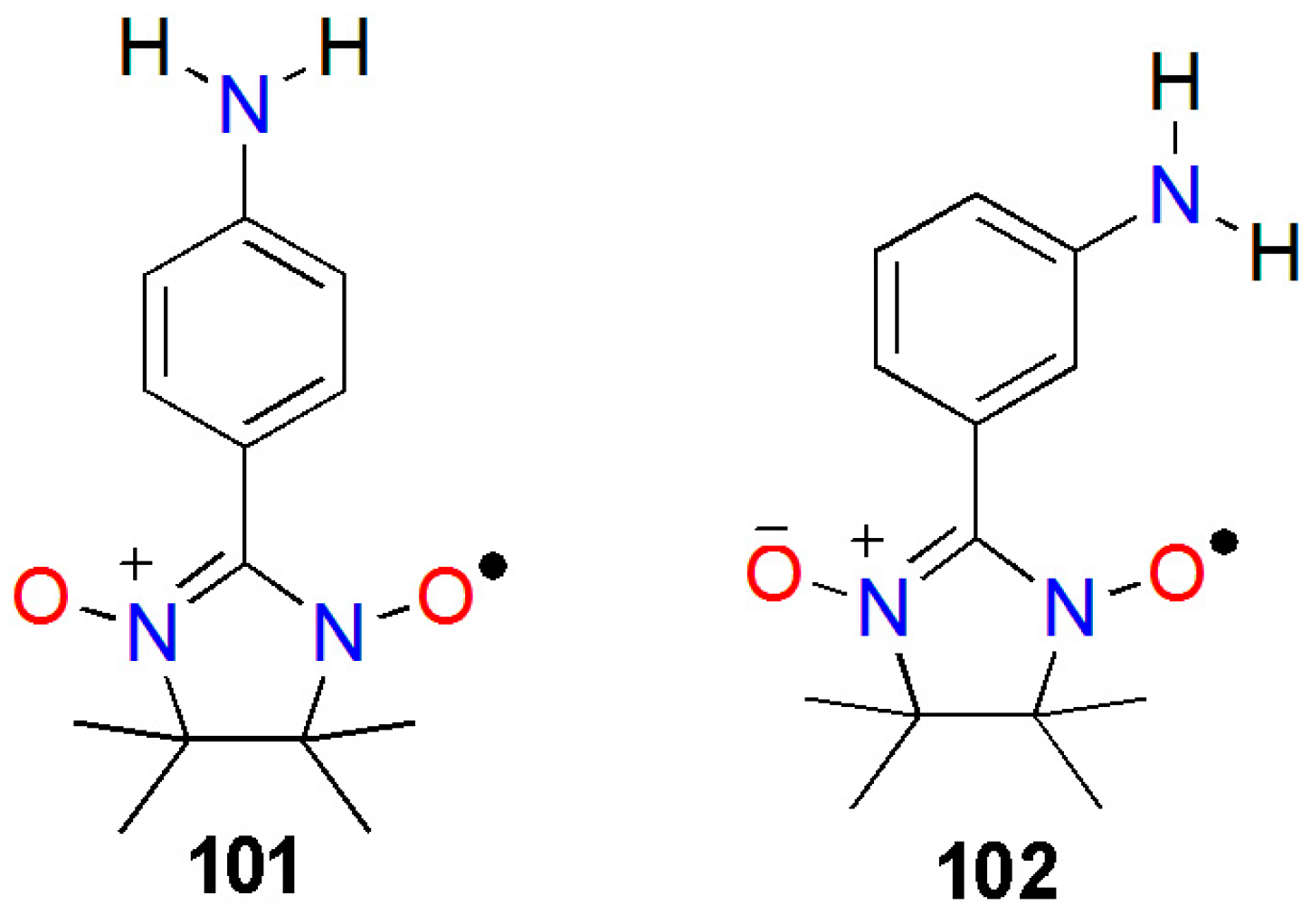 Aminophenylnitronylnitroxides comprise two N-H-based H-bond donors, which form prevalent hydrogen-bonding interactions in their N-H crystal lattices. Lahti et al. have reported the synthesis and magnetic properties of 2-(para-aminophenyl)-4,4,5,5-tetramethyl-4,5-dihydro-1H-imidazole-3-oxide-1-oxyl (pAPN) (101) and 2-(meta-aminophenyl)-4,4,5,5-tetramethyl-4,5-dihydro-1H-imidazole-3-oxide-1-oxyl (mAPN) (102) (Chart 4) [139]. The intermolecular contacts, with effective spin orbital overlap between high-spin-density nitronylnitroxide sites involving the N–O units, result in strong magnetic exchange interactions. Compound 102 exhibited a Curie constant of C = 0.368 emu·K/Oe·mol, and a substantially large AFM Weiss constant of θ = −36.2 K (Figure 3a). A maximum at 40–50 K was revealed from the χ versus T plot, which is characteristic of the AFM exchange (Figure 3b).