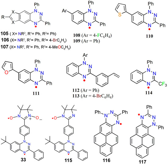 Casu et al. reported the synthesis of radical 116 [148]. During the synthesis they considered two possible constitutional isomers, 116 and 117, due to the two different modes of fusing pyrene and Blatter radicals: 1,3-diphenyl-1,4-dihydro-1,2,4-triazin-4-yl. The DFT calculation showed significant out-of-plane twisting in the pyrene moiety and high energy in the constitutional isomer 117; thus, they selected 116. The EPR spectrum of 116 in benzene at room temperature showed hyperfine coupling.