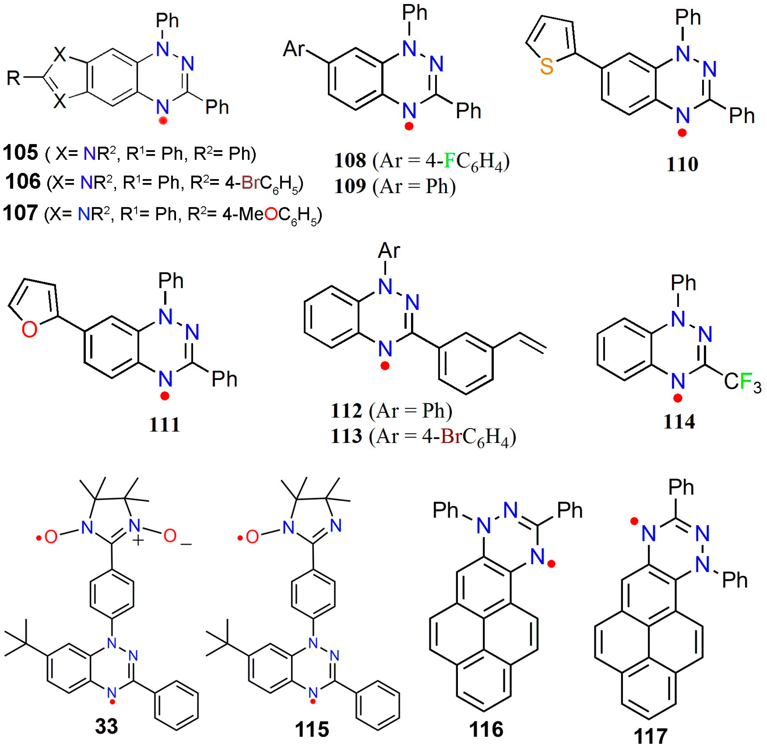 The 1,2,4-benzotriazin-4-yls were first reported by Blatter et al. in the late 1960s [47]. Koutentis et al. have reported the synthesis of a series of imidazolo-, oxazolo-, and thiazolo-fused 1,2,4-benzotriazinyls and deliberated on the dimensionality of the magnetic interactions of these systems. This group studied the magneto-structural correlations based on variable-temperature (VT) studies of 1,3,7,8-tetraphenyl-4,8-dihydro-1H-imidazolo [1,2,4] benzotriazin-4-yl (105), 8-(4-bromophenyl)-1,3,7-triphenyl-4,8-dihydro-1Himidazolo [1,2,4] benzotriazin-4-yl (106), and 8-(4-methoxyphenyl)-1,3,7-triphenyl-4,8-dihydro-1H-imidazolo[1,2,4] benzotriazin-4-yl (107) (Chart 6) [142].