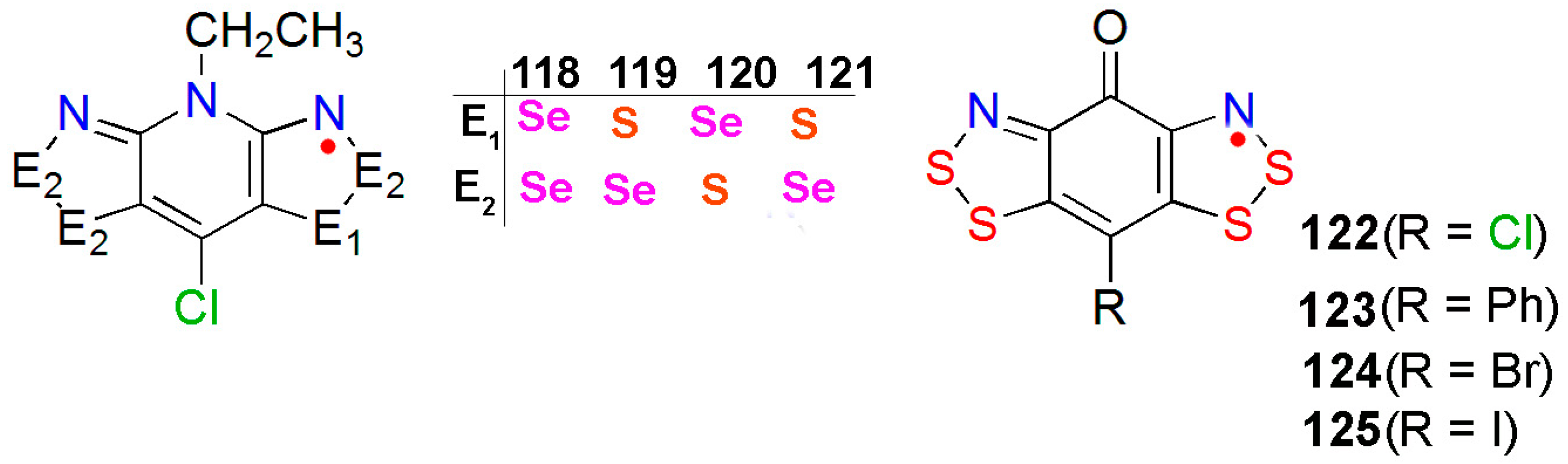 The first thiazolyl radical was reported in 1985 by R. Mayer [56,57]. Thiazyl-based neutral radicals are highly interesting since the sulfur heteroatom augments intermolecular magnetic and electronic interactions. Among them, the radicals based on the pyridine-bridged bis-dithiazolyl framework are remarkable molecular constructs as their solid-state structures as well as their transport properties can be modulated by varying the peripheral ligands or by the replacement of sulfur by selenium. Oakley et al. have also reported the bis-diselenazolyl radicals by simple replacement of S by its heavier Se analogue. They have prepared a series of isostructural S/Se-containing variants (Chart 7: 118–121) [149].