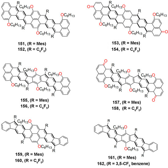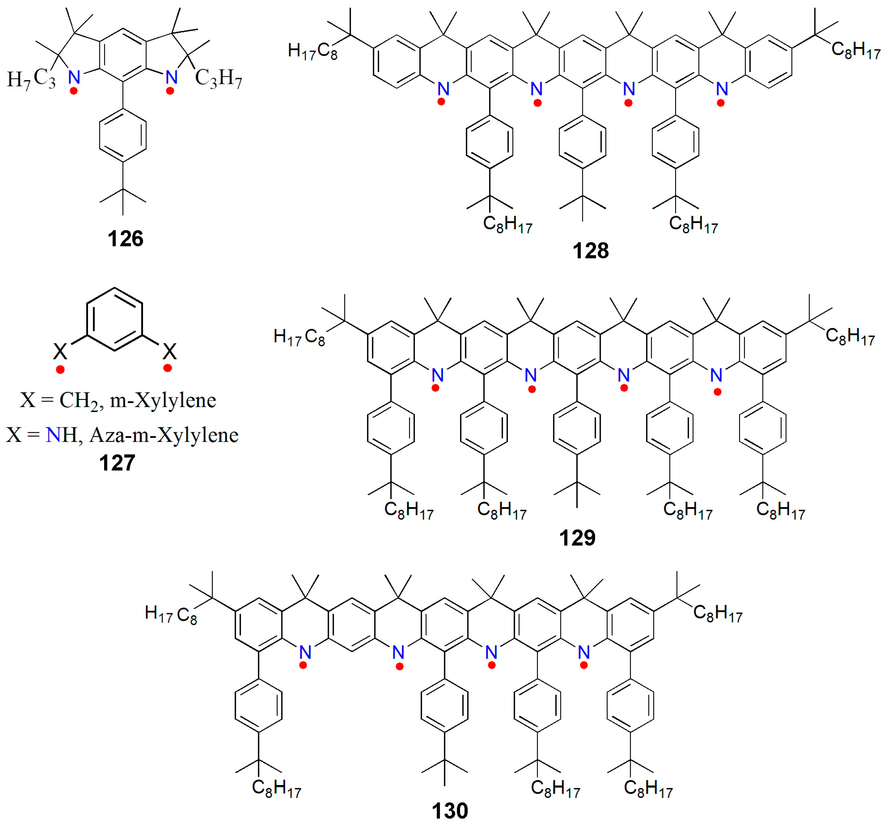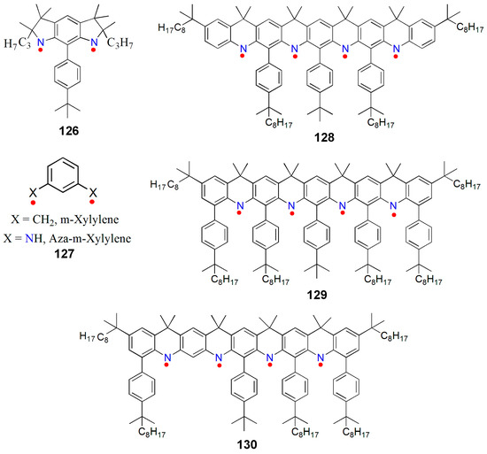Rajca et al. also reported a series of aminyltetraradicals, 128–130, and their magnetic properties (Figure 14) [153]. In 125–127, an effective 2pπ–2pπ overlap within the π-system of aminyl radicals and m-phenylenes was possible as a result of the planarity of the tetraazanonacene backbone. A quintet (S = 2) ground state could be established separated from the low spin-excited states by an energy gap of ΔE ~5 kcal·mol−1. Interestingly, the carbon and nitrogen atoms with predominant spin densities are sterically shielded, which enhanced the stability of the tetraradicals without disturbing the planarity of the radical system. The tetraradical 129 possessed five 4-tert-alkylphenyl steric groups, and in 2-methyltetrahydrofuran at room temperature it possessed a half-life of 1 h.