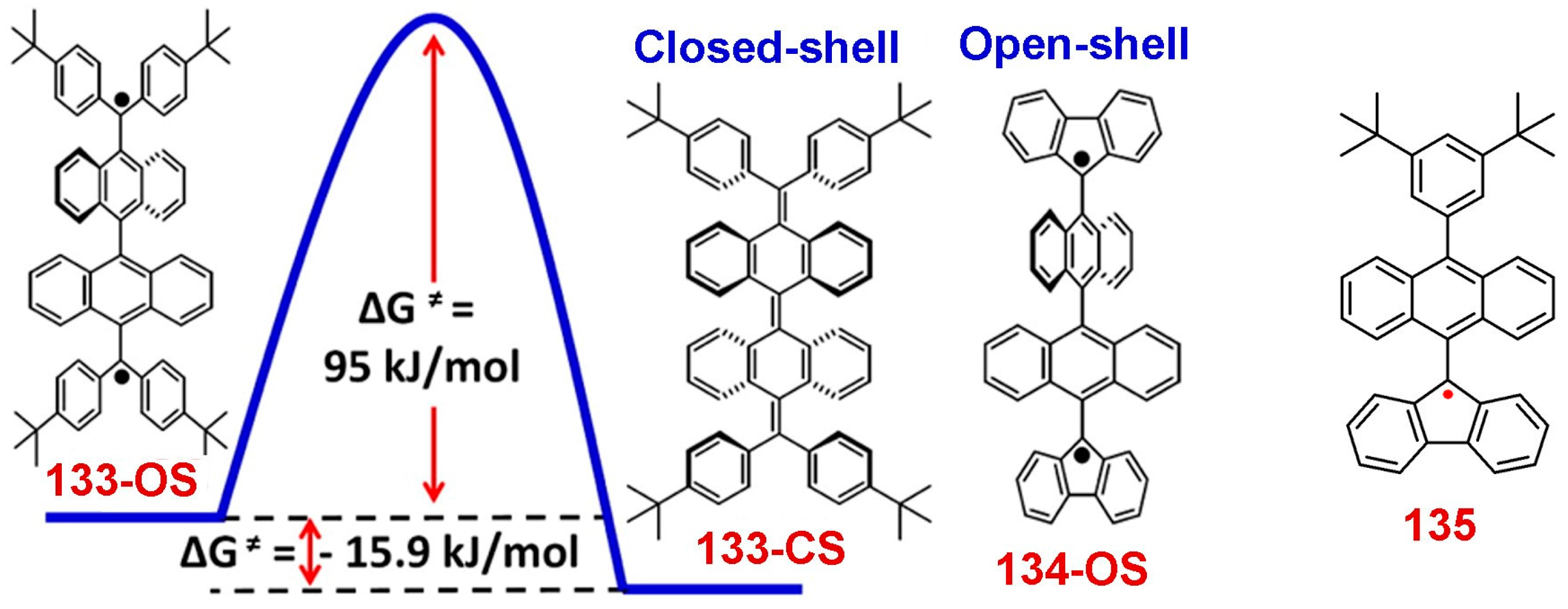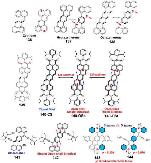 The polycyclic aromatic hydrocarbons (PAHs) with an open-shell configuration denote a unique type of hydrocarbon radical comprised of one or more π-electrons which are not firmly paired into the bonding molecular orbital in the ground state. The class of PAHs with two weakly bound π-electrons is referred to as biradicals. The two unpaired electrons can be either in a low-spin singlet or in a high-spin triplet state. A thermally excited transition from the singlet to triplet state can result in a paramagnetic property, although the molecule is a singlet in the ground state. This is only possible if the singlet-triplet energy gap () is adequately small. Several types of stable open-shell PAHs have been synthesized: (1) quinodimethane derivatives; (2) phenalenyls; (3) teranthene; and (4) zethrenes. Molecules sustaining a characteristic resonance structure between closed shell and open shell, known as Chichibabin’s hydrocarbon, have also been studied in detail.
