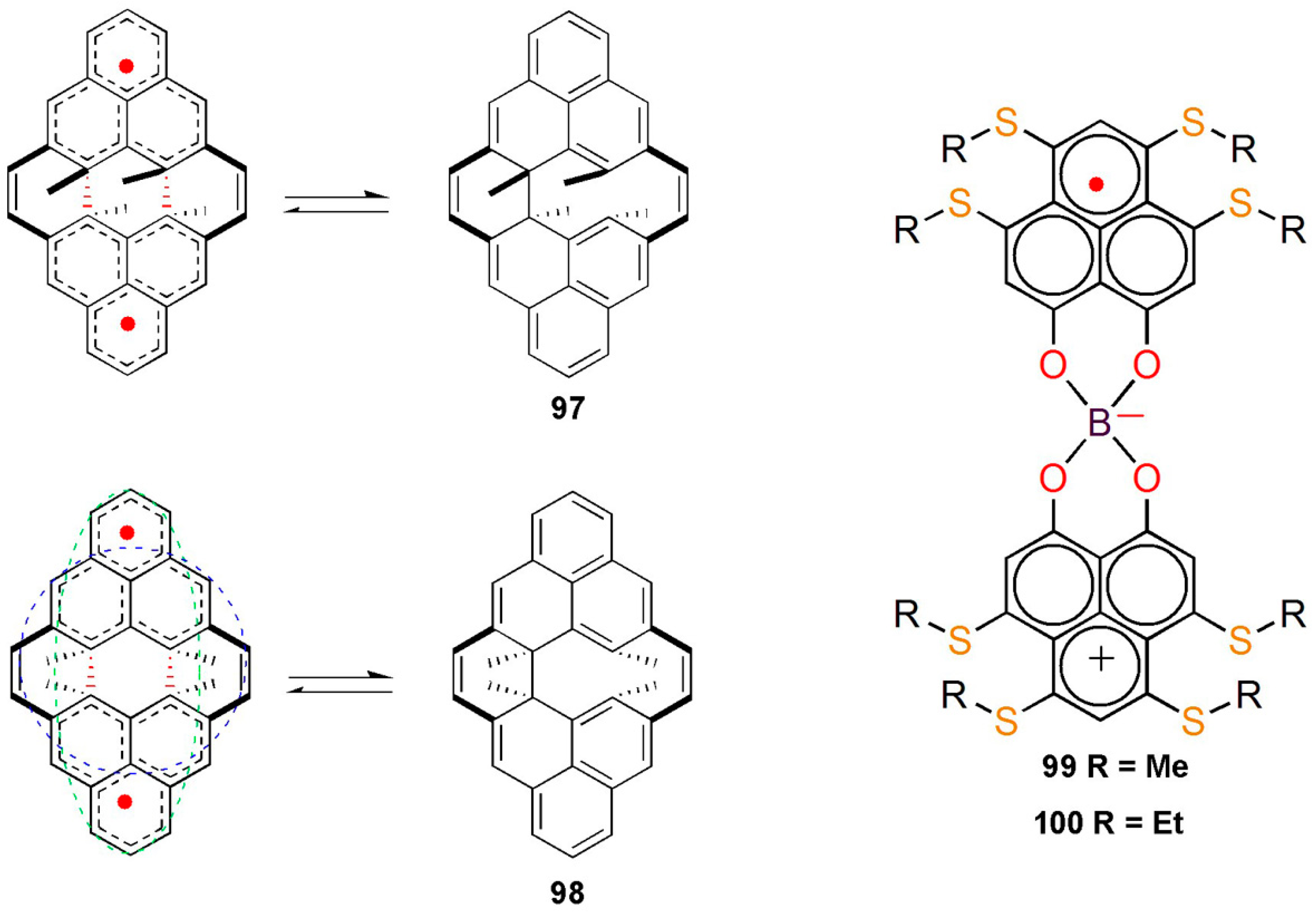Left column depicts the valence tautomerizations between π-dimers and right column shows the valence tautomerizations between the σ-dimers of the chair 97 and boat conformations 98 of the cyclo-biphenalenyl biradicaloid molecule. The 2e/mc (multi-centered) π-π bondings are represented by the red/green/blue dashed lines/curves. The hydrogen atoms have been removed for clarity. Reproduced from Reference [137]. Copyright 2011 American Chemical Society. And the molecular structure of 99 and 100.
