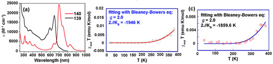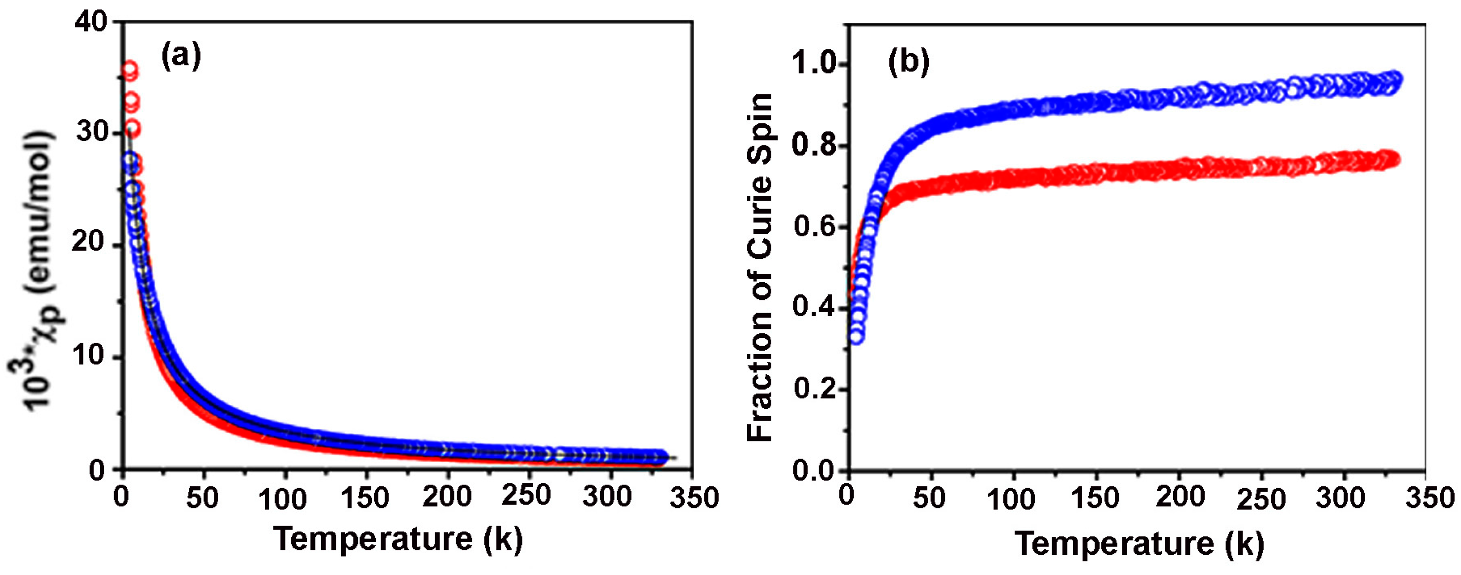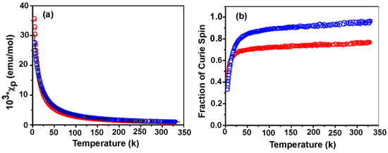 (a) Plots of the magnetic susceptibilities of 99 (red) and 100 (blue). Note the black line representing the Curie-Weiss fit of the magnetic data for 100; (b) Fraction of Curie spins obtained from T for 99 (red) and 100 (blue). Reproduced from Reference [138]. Copyright 2013 American Chemical Society.