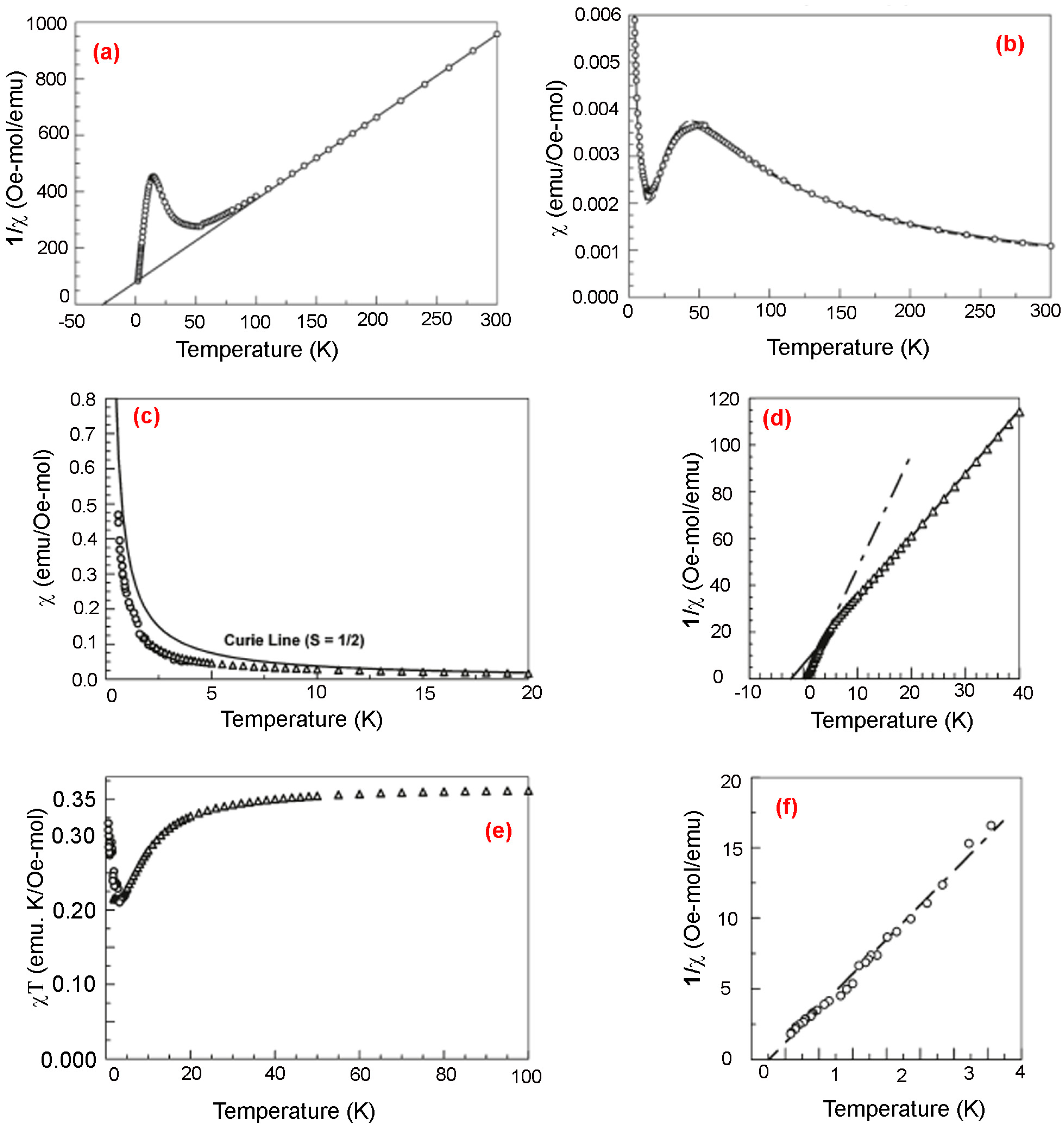 Plots for the paramagnetic susceptibility data of 102: (a) 1/χ vs. T plot linearly fitted and (b) χ vs. T fitted with without meanfield (broken line) and including mean field (solid line the data was acquired using the 1000 Oe external field. Paramagnetic susceptibility data for 101: (c) χ vs. T plot; with noninteracting spin curie line(d) 1/χ vs. T plot depicting linear fits to data at higher (solid line) and lower (broken line) temperature regions: (e) χT vs. T plot; and (f) low temperature 1/χ vs. T plot depicting the linear fit to data. The data obtained at T > 1.8 K at 1000 Oe are shown in triangles and the data collected by ac-susceptibility with zero field at 0.6 K < T < 4 K are shown with circles. Reproduced from Reference [139]. Copyright 2011, American Chemical Society.
