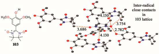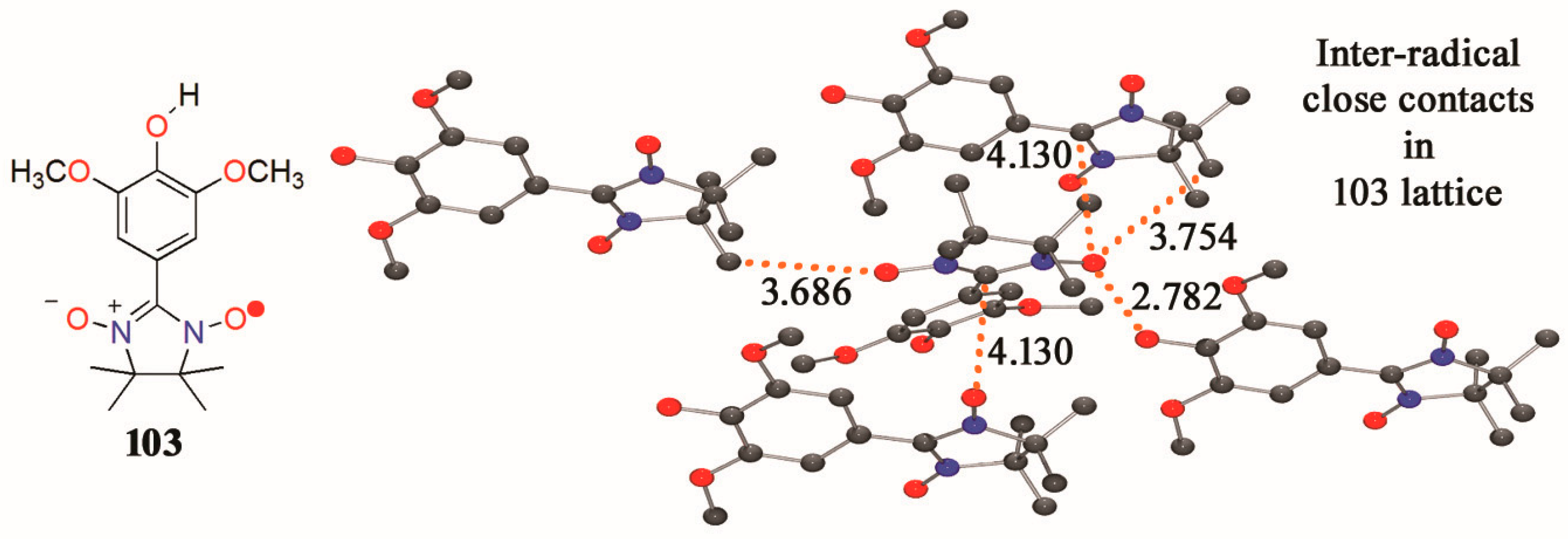 Lahti et al. reported the synthesis of 2-(3′,5′-dimethoxy-4′-hydroxyphenyl)-4,4,5,5-tetramethyl-4,5-dihydro-1H-imidazole-1-oxyl (103), also called “syringylnitronylnitroxide” (SyrNN) [140] (Figure 4). X-ray crystallography results clearly established inter-radical close contacts formed by O–H···O and C–H···O types of H-bonds (Figure 4).