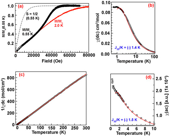 (a) Plot of molar magnetization normalized to saturation magnetization (M/Ms) versus field at 0.55 K (upper, black data) and 2.0 K (lower, red data). The Brillouin curve for isolated S = 1/2 spins at 0.55 K and magnetic susceptibility versus temperature is depicted by the dashed lines; (b) Plot of χdc versus T at 1000 Oe external field; (c) Plot of 1/χac versus T data in zero external field (modulation 10 Oe, frequency 155 Hz); and (d) shows χac versus T data in zero external field (modulation 10 Oe, frequency 155 Hz). The solid red lines exhibits fits to an AFM 2D square planar model without mean field correction. Reproduced from Reference [140]. Copyright 2013, American Chemical Society.