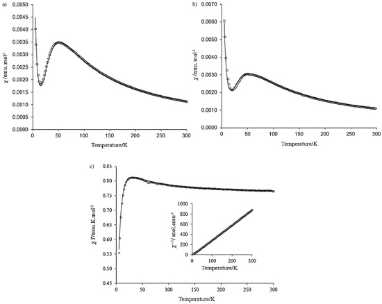 The molar susceptibility (χ) for the radicals 105 and 106 increased gradually upon cooling from 300 K and reached a broad maximum at Tmax = (50 ± 2) and (50 ± 4) K, respectively, which indicated strong antiferromagnetic interactions (Figure 6a,b). Further, χ decreased gradually down to 15 K for 105 and to 20 K for 106 before it increased subsequently at lower temperatures. The uncoupled radicals at defect sites in the lattice were thought to be responsible for this increase in χ at low temperatures. On the other hand, 107 displayed different a magnetic behavior as it followed Curie-Weiss behavior between 5 and 300 K with C = 0.338 emu·K·mol−1 close to the value expected for S = 1/2 spin (Figure 6c). The positive Weiss constant of 1.83 K indicated the presence of local FM interactions between the radicals. Upon lowering the temperature from 300 K, χT increased and attained a maximum at Tmax = (30 ± 4) K. Below this temperature, χT fell sharply, suggesting the presence of AFM interactions at low temperatures.
