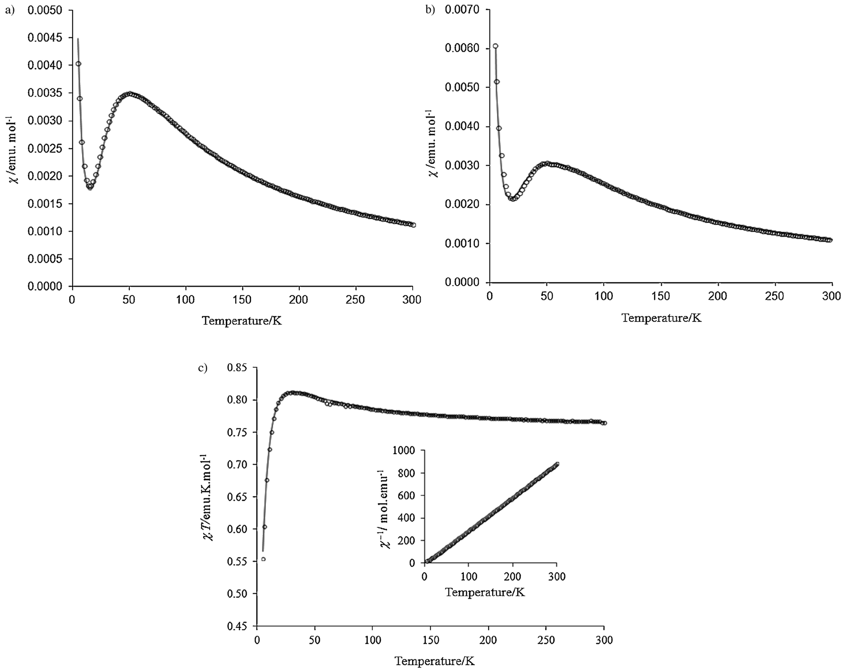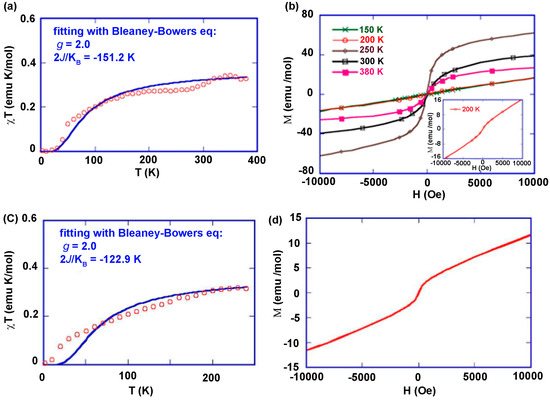 A strong AFM-coupled paramagnetic behavior could be established from the cooling curve plots of χ and χT versus T for solvated 122 (Figure 10a,b), which was measured using an external field of H = 1 kOe [150]. Remarkably, a large negative θ value of −61.7 K was realized from the Curie–Weiss fit over the range 100–300 K. However, there was no substantiation for a structural or magnetic phase transition upon cooling the sample to 2 K. The high-temperature cooling curve data (with H = 1 kOe) for the unsolvated material 122 (Figure 10c,d) also suggested an AFM-coupled Curie-Weiss paramagnet with θ = −27.0 K. On the other hand, upon cooling below 10 K, this magnetic material demonstrated a sharp increase in χ as well as χT.