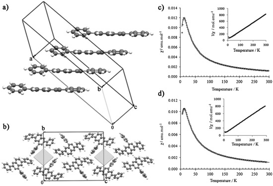 Packing of 109. (a) The π-stacks of radicals along the c-axis (N-phenyls have been removed for clarity); (b) Antiparallel chains along the a-axis form voids as depicted by grey boxes. Plot of χ versus T for radicals 108 (c) and 109 (d). The solid line denotes the best fit to the 1D AFM regular linear chain model. For radical 108, J = −12.9 cm−1, zJ’ = −0.4 cm−1, g = 2.0069; For radical 109, J = −11.8 cm−1, zJ’ = −6.5 cm−1, g = 2.0071. Inset shows the Curie-Weiss behavior in the 50–300 K region, C = 0.374 emu·K·mol−1, θ = −11.3 K for 108 and C = 0.379 emu·K·mol−1, θ = −19.2 K for 109. Reproduced with permission from Reference [143]. Copyright 2012, Wiley-VCH.