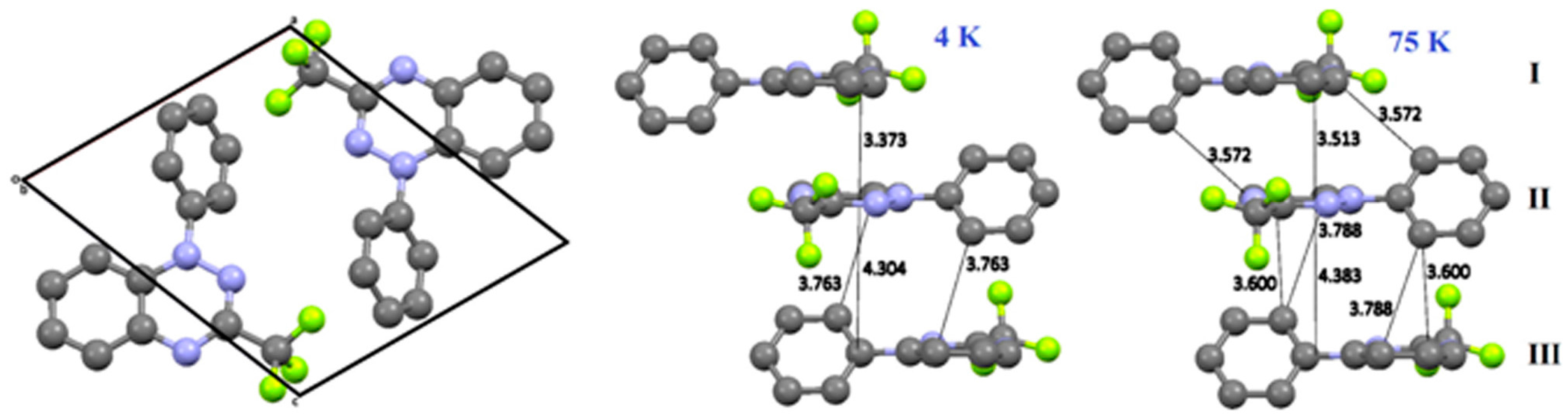 In a significant development, Koutentis et al. reported the synthesis of 1-phenyl-3-trifluoromethyl-1,4-dihydrobenzo[e]-[1,2,4]triazin-4-yl (114) [147], and it is the first example of a hydrazyl radical that demonstrates a reversible sharp spin transition between a paramagnetic and a diamagnetic phase at 58(2) K. Notably, this transition is completed within a slender temperature range of 5(1) K. The first-order transition proceeds via small changes in the intra- and inter-stack interactions between comparable structural phases. X-ray crystallography demonstrated clear changes in the intermolecular interactions at 4 K and 75 K (Figure 8). This offers significant future potential to use different stimuli to drive such phase changes.