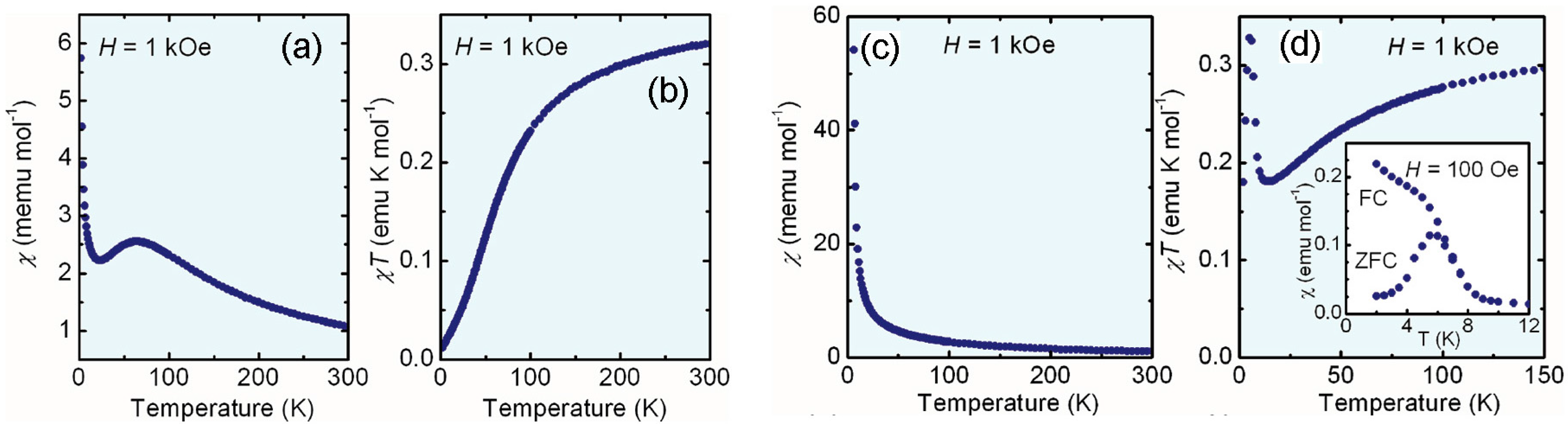 (a) A plot of field-cooled, χ versus T; and (b) p of χT versus T for solvated 122 at H = 1 kOe; (c) Plot of field-cooled χ versus T for unsolvated 122 at H = 1 kOe; (d) Field-cooled χT versus T plot for unsolvated 122 at H = 1 kOe. Inset depicts a ZFC/FC plot of χ versus T at H = 100 Oe. Reproduced from Reference [150]. Copyright 2011, American Chemical Society.
