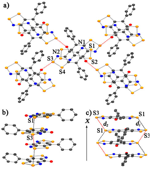 (a) A view of the unit cell of 123, viewed perpendicular to the yz plane, with intermolecular S3···O’ supramolecular contacts depicted with dashed lines; (b,c) Views of the ABABAB π-stacks in 120, with S1···S3 contacts d1 and d2. Reproduced with permission from Reference [151]. Copyright 2011, the Royal Society of Chemistry.