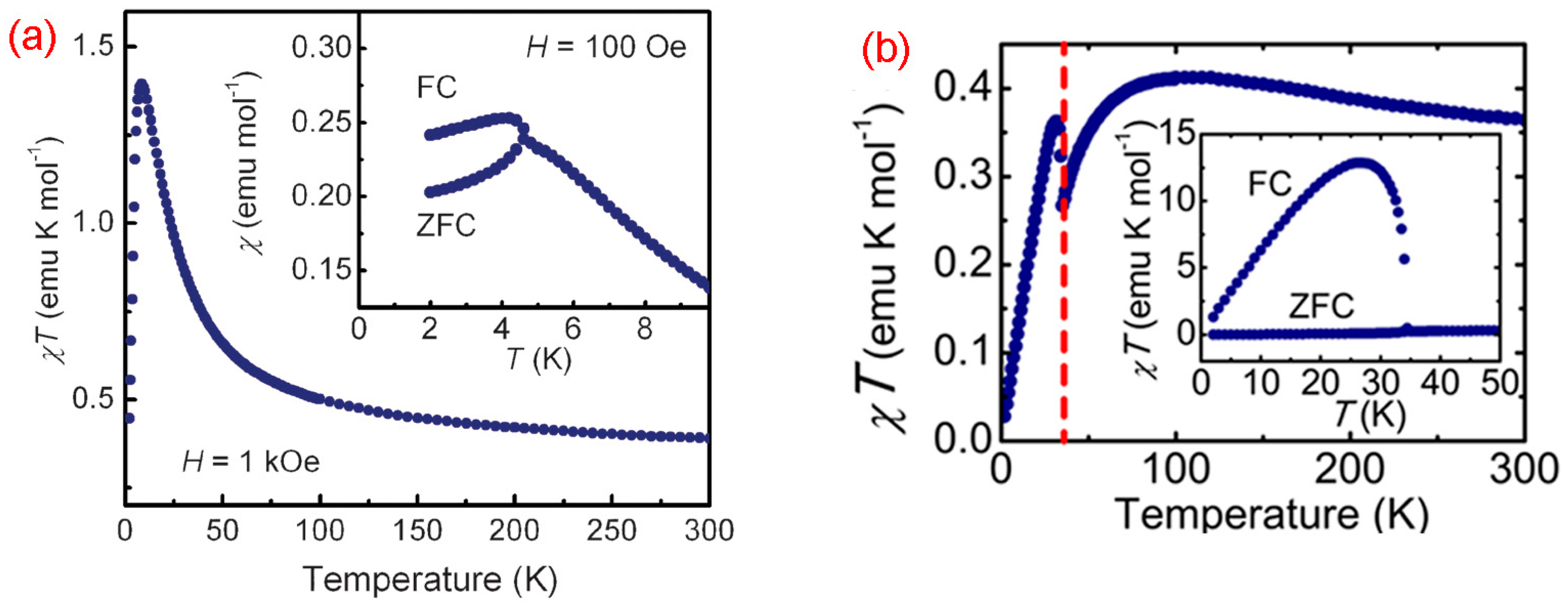 (a) The χT vs. T plot for 123 at H = 1 kOe. Inset exhibits ZFC-FC plots of χ vs. T at H = 100 Oe. Reproduced with permission from Reference [151]. Copyright 2011, the Royal Society of Chemistry; (b) Field-cooled χT vs. T plot for 125, at H = 1 kOe. Inset shows the ZFC-FC plot of χT vs. T at H = 10 Oe. Reproduced from Reference [152]. Copyright 2015, American Chemical Society.