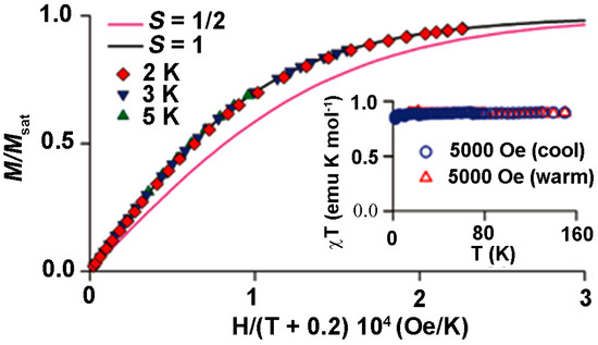 A plot of M/Msat vs. H/(T − θ) from the SQUID magnetometry data of 126 in 2-Me THF (20 mM). Inset shows a plot of χT vs. T. θ = −0.2 K, Msat = 0.89 μB, S = 1.0, and χT = 0.89 emu·K·mol−1. Reproduced from Reference [67]. Copyright 2011, American Chemical Society.
