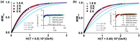 A plot of M/Msat vs. H/(T − θ) from the SQUID magnetometry data of: (a) 128 (6.6 mM) and (b) 129 (7.9 mM) in 2-MeTHF. The magnetization at 1.8, 2, 3, and 5 K is plotted with Brillouin functions for S = 1/2, 1, 3/2, and 2. Inset plots exhibit the magnetic susceptibility at 500 and 5000 Oe plotted as χT versus T, and the solid line represents the numerical fit to the Heisenberg Hamiltonian for the dimer of S = 2 tetraradicals. Reproduced from Reference [153]. Copyright 2013, American Chemical Society.