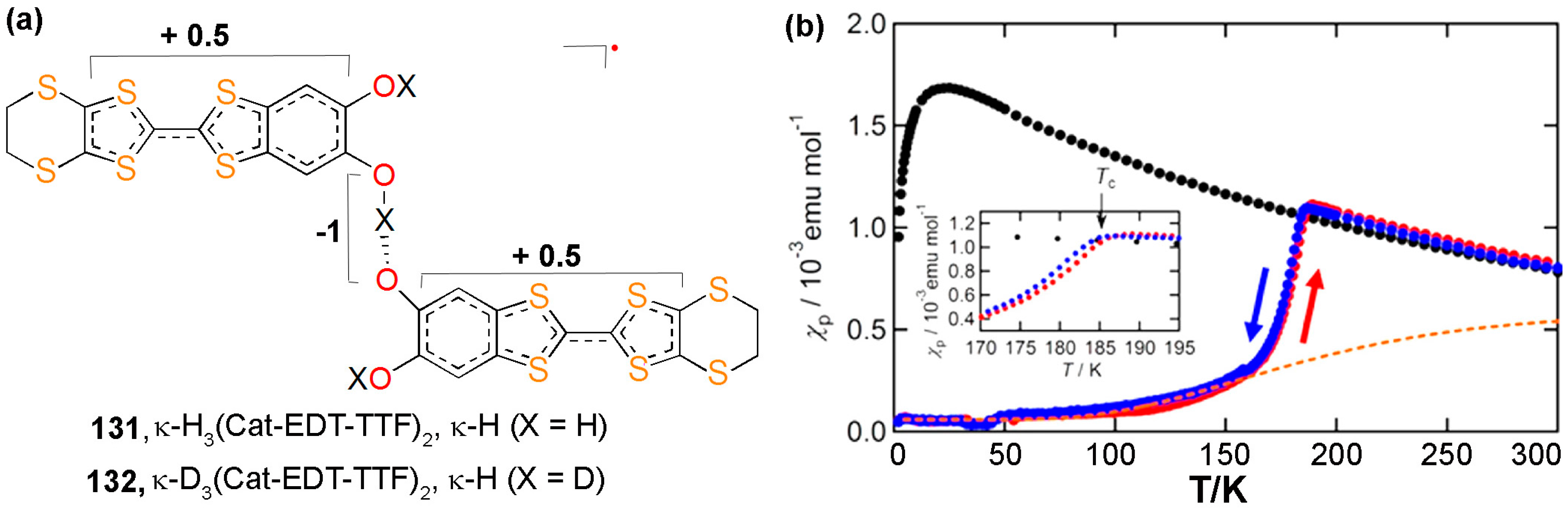 Mori et al. reported an exceptional H-bond dynamics–based switching of electrical conductivity and magnetism in a deuterated congener, i.e., κ-D3 catechol-fused ethylenedithiotetrathiafulvalene (Cat-EDTTTF)2 (132) of an H-bonded organic conductor (Figure 15a) [154]. They found κ-H and κ-D to be isostructural paramagnetic semiconductors having a dimer-Mott–type electronic structure at room temperature. Notably, only κ-D underwent a phase transition at 185 K, and it transforms to a nonmagnetic insulator with a charge-ordered electronic structure.