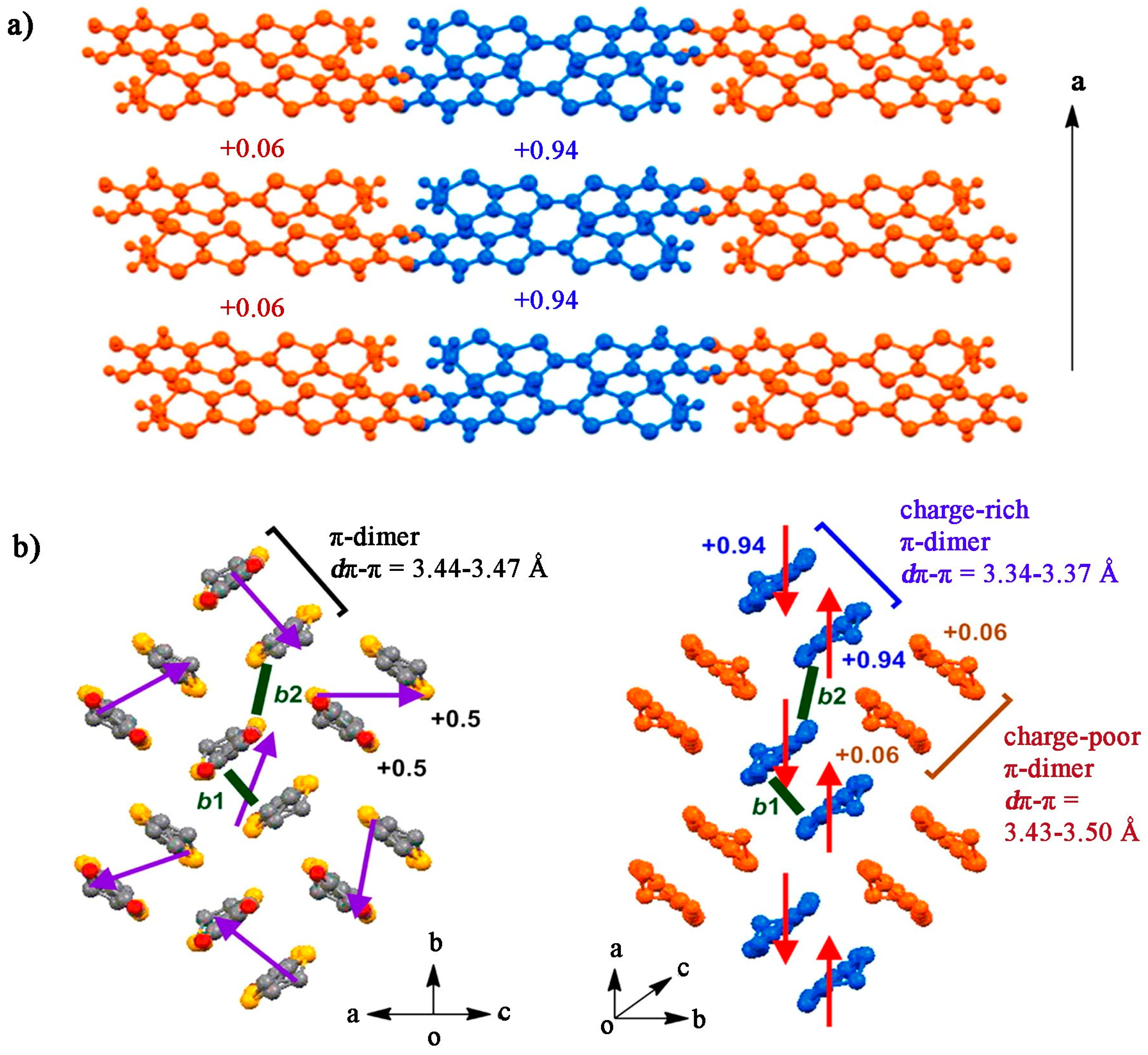 A view of the crystal packing of κ-D (132). (a) Arrangement of the Cat-EDT-TTF building blocks at 50 K and (b) within the conducting layer (left: 270 K, right: 50 K). The charge-rich (+0.94) and charge-poor (+0.06) Cat-TTF building blocks, are represented by the blue- and orange-colored molecules, respectively. The intermolecular transfer integrals within and between the π-dimer(s) are represented by parameters b1 and b2, respectively (b1 = 218 meV, b2 = 79 meV at 270 K (left) and b1 = 335 meV, b2 = 79 meV at 50 K (right)). Reproduced from Reference [154]. Copyright 2014, American Chemical Society.