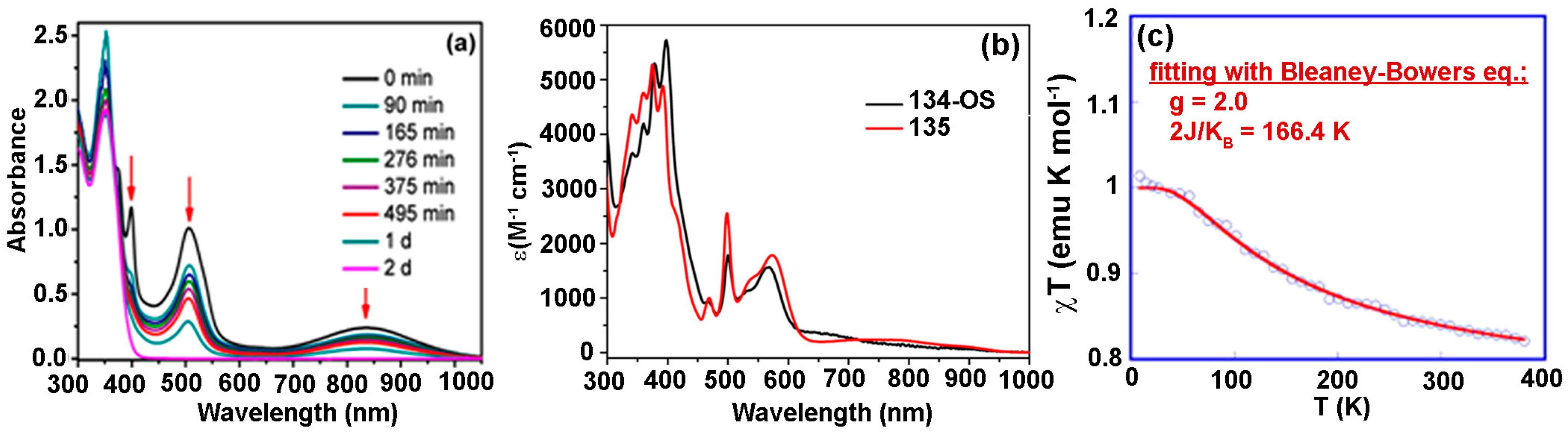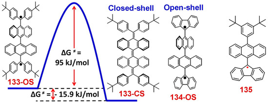 Wu et al reported derivatives of Chichibabin’s hydrocarbon, 133-CS/133-OS and 134-CS/134-OS (Figure 17) [155]. The time-dependent UV–vis–NIR absorption spectra of the 133-OS biradical showed that the absorption spectrum of the biradical diminished with time and the final spectrum after the decay entirely matched with the stable quinoidal form 133-CS (Figure 18a). Further, 1HNMR spectroscopy also nicely delineated this slow relaxation process and established a transition from an unstable 133-OS to a stable 133-CS. On the other hand, 134-OS exhibited a significantly red-shifted absorption in the near-infraredNIR region, which was attributed to a small highest occupied molecule orbital and lowest un-occupied molecular orbital HOMO-LUMO energy gap of 1.28 eV (Figure 18b). Notably, even after cooling to −100 °C, 134-OS did not show any NMR signals at room temperature, suggesting the presence of considerable paramagnetic species.
